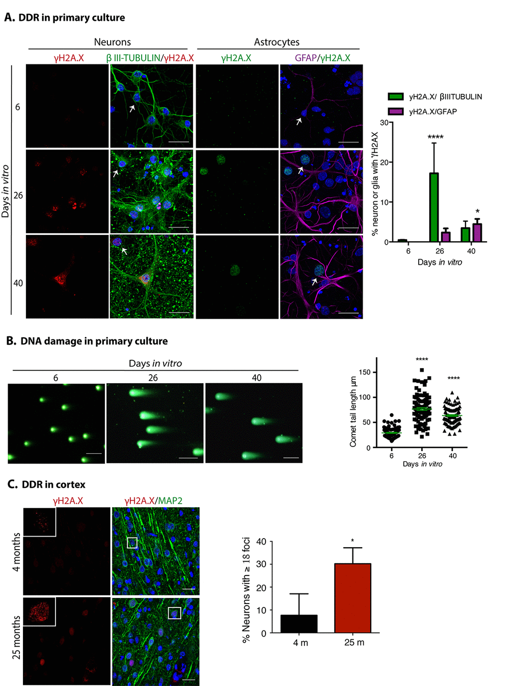 Another hallmark of senescence is a persistent DNA damage response, commonly detected by the presence of γH2AX foci. As shown in Figure 3A, neuronal cells accumulated γH2AX foci at 26 DIV, accompanied by ruptures of DNA detected by Comet assay (Figure 3B). Even though we are not able to distinguish neurons from glial cells with this assay, it is conceivable that the nuclei with broken DNA come from neurons, since we observed that mainly neurons had γH2AX foci; these observations suggest that neurons accumulate DNA damage leading to a persistent DNA damage response. At both 26 and 40 DIV, only a small proportion of GFAP expressing cells had γH2AX foci. As expected, cortical neurons from old rat brains also contained more γH2AX foci (Figure 3C).