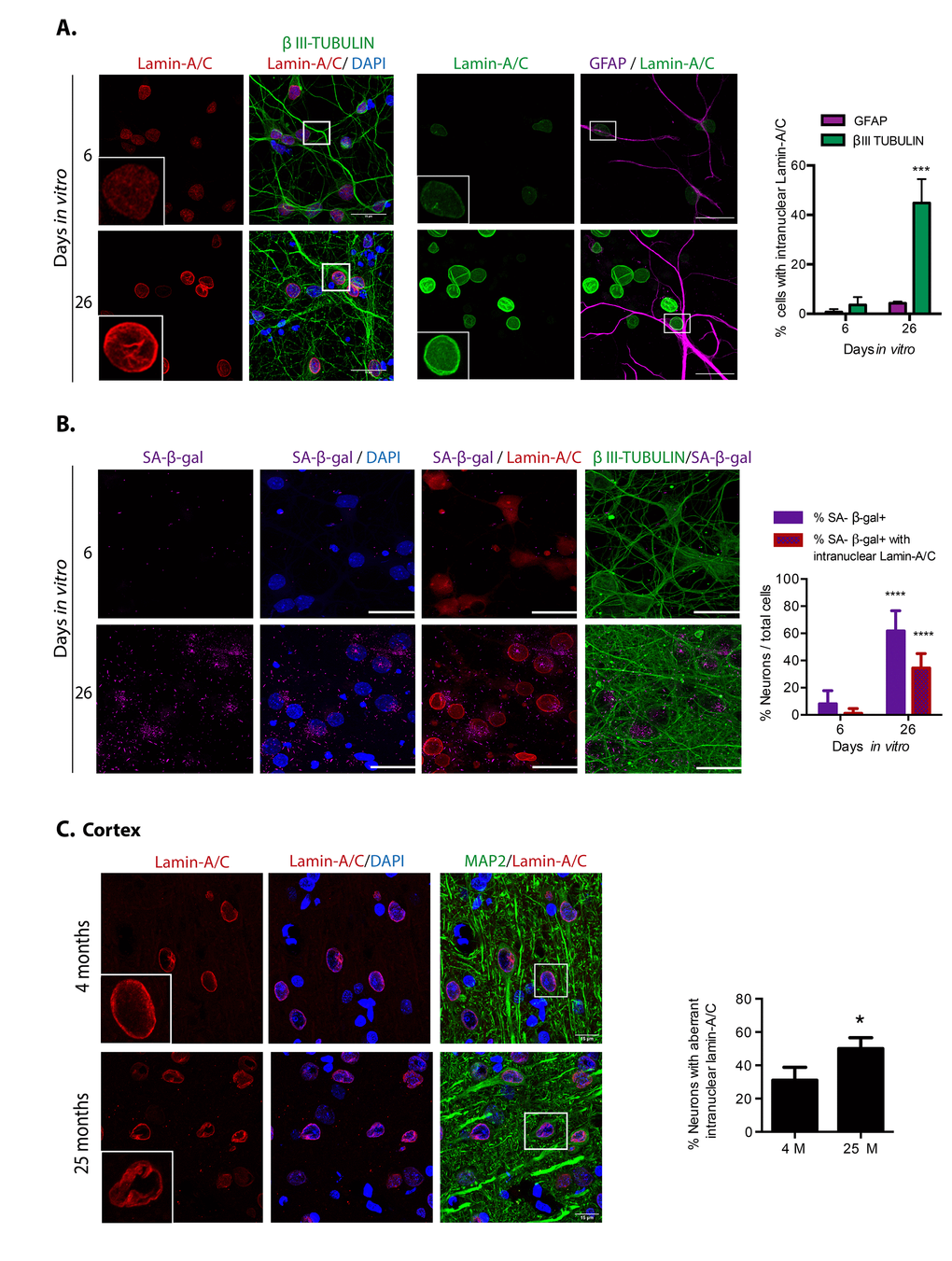 Finally, since during oncogene-induced senescence, replicative senescence and senescence induced by DNA damaging drugs occur nuclear morphology abnormalities associated with nuclear envelope proteins loss [26], and depletion of Lamin-B1 or Lamin-A/C is sufficient to induce senescent features [4], we wondered whether also senescent post-mitotic cells, such as neurons, would manifest nuclear morphology deformations. As shown in Figure 4, indeed both in vitro and in vivo senescent neurons had irregular nuclear morphology with folds of the nuclear envelope forming intra-nuclear Lamin-A/C structures that protrude into the nucleoplasm. Very few astrocytes showed abnormal distribution of Lamin-A/C at 26 DIV, strengthening the notion that neurons become senescent before glial cells in this model. Since every senescent feature, alone, is not sufficient to confirm a senescent state, we simultaneously detected SA-β-gal activity and Lamin-A/C in neurons. As shown in Figure 4B, around half of the neurons with high SA-β-gal activity at 26 DIV also had an aberrant nuclear morphology, supporting the notion that neurons in long-term culture acquire senescent features. The observation that some neurons with high SA-β-gal show a normal nuclear morphology, is in agreement with previous observation that SA-β-gal activity alone is not a reliable marker of senescence [21]. We propose that nuclear deformations could be a more reliable marker for neuronal senescence. Since differentiated neurons express low levels of Lamin-B1 [27], we were unable to detect loss of Lamin-B1 in senescent neurons.