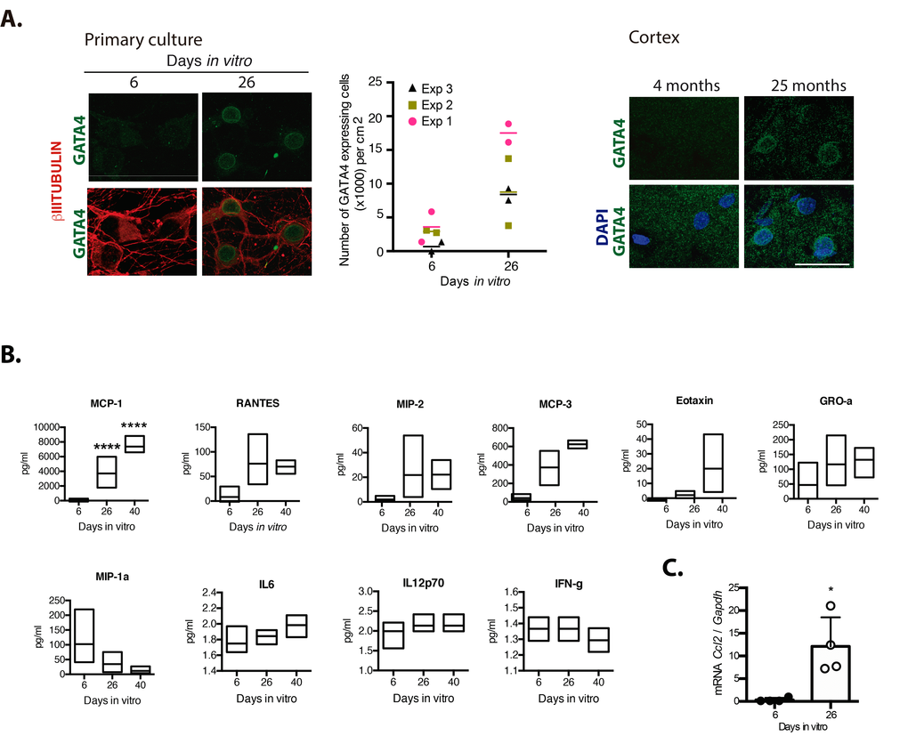 We hypothesize that persistent senescent neurons, through the SASP, contribute to induce paracrine senescence and chronic inflammation in old brains. Therefore, we studied whether neurons would express GATA4, a transcription factor that promotes the expression of SASP factors [10]. As shown in Figure 5A, GATA4 accumulated in neuronal cells cultured for 26 DIV, as well in cortical neurons from old brains. To get an insight about the cytokines that senescent cortical cells could be secreting, we analyzed the presence of G-CSF, GM-CSF, IFNγ, IL-1α, IL-1β, IL-10, IL-12p70, IL-13, IL-17A, IL-2, IL-4, IL-5, IL-6, TNFα, EOTAXIN, GRO-α, IP-10, MCP-1, MCP-3, MIP-1α, MIP-2 and RANTES by a multiplex immunoassay. As shown in Figure 5B, MCP-1, RANTES, MIP-2, GRO-1, MCP-3 and EOTAXIN were more abundant in conditioned media from senescent cortical cultures, although only MCP-1 content showed a statistically significant difference at 26 and 40 DIV relative to 6 DIV cortical cultures; MIP-1a secretion was reduced in older cultures. To our surprise, IL6, a common SASP component, was barely detected and did not increase in conditioned media from senescent cells. Also, IL-12p70 and IFNγ secretion did not change along the time in culture and were secreted in a very small amount, at the threshold limit of detection. G-CSF, GM-CSF, IL-1α, IL-1β, IL-10, IL-13, IL-17A, IL-2, IL-4, IL-5, TNFα, GRO-α, IP-10 and MIP-1α were not detected at any time point. We further confirmed the induction of expression of Ccl2 (gen coding for MCP-1) by qRT-PCR (Figre 5C).