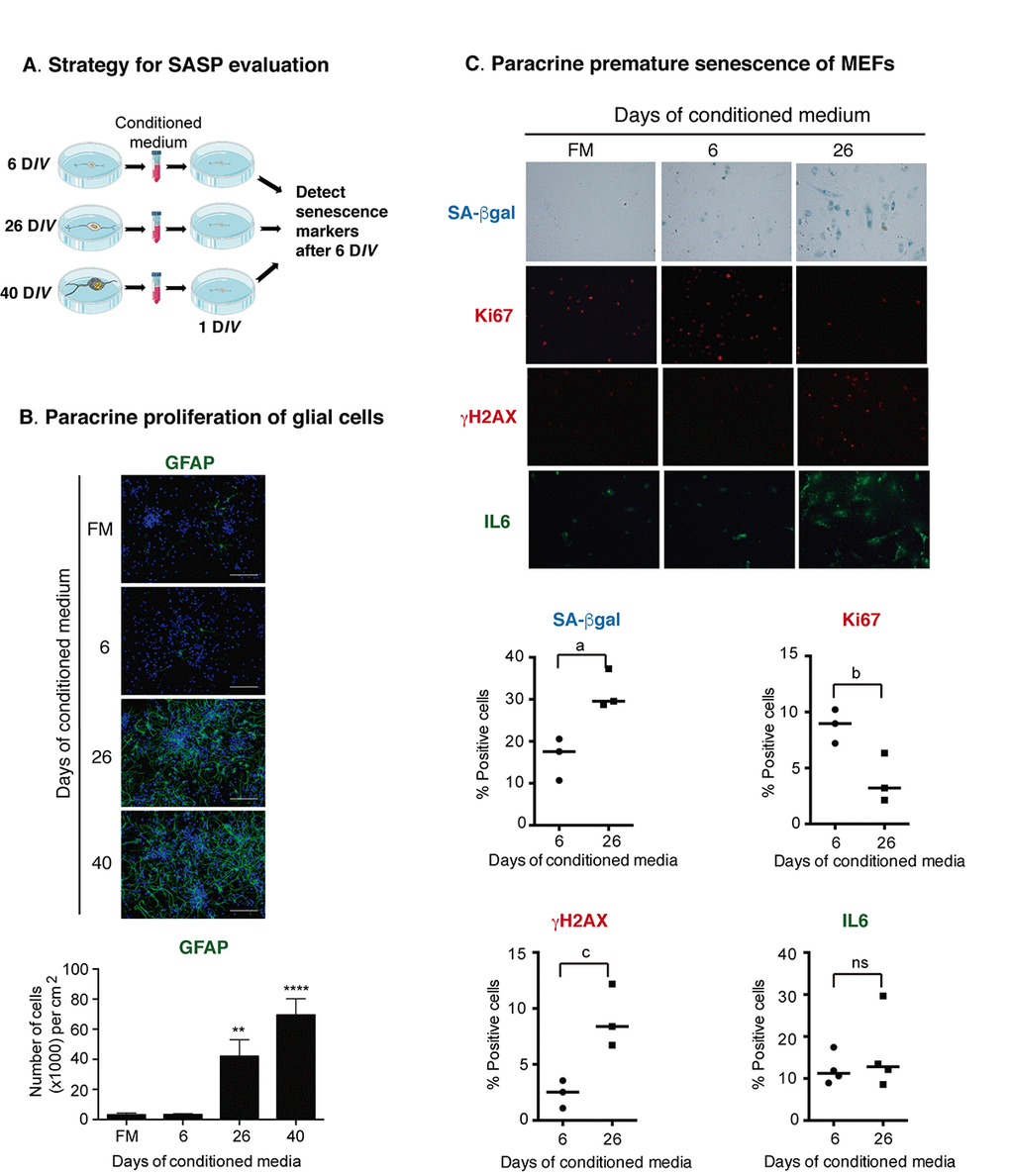 Since MCP-1 has been shown to induce paracrine senescence [23], and GATA 4 is a mediator regulating MCP-1 expression during senescence induced by Lamin-A defects [28], we reasoned that senescent cortical cells could indeed acquire a functional SASP. To test this hypothesis, we analyzed whether conditioned media from senescent cortical cells could induce premature paracrine senescence (a schematic experimental design is shown in Figure 6A). To obtain conditioned media with accumulated secreted factors, the media was left for intervals of about a week in between fresh media changes over the cells, and it was collected at 6, 26 or 40 days of culture. Conditioned media was then added to young (1 DIV) prenatal cortical cells and after 6 DIV of treatment all the senescent markers described above were evaluated. Interestingly, conditioned media from cortical cells cultured for 26 DIV or 40 DIV induced abundant proliferation of glial cells (Figure 6B), suggesting that senescent cortical cells, potentially neurons, could indeed affect tissue organization. Nevertheless, we did not observe significant expression of senescent markers on young neurons (not shown). We reasoned that young neurons could be more resistant to paracrine senescence than mitotic cells; therefore, we tested whether the conditioned media from cortical cells cultured for 26 DIV, time at which most of the senescent cells are neurons, would induce paracrine senescence in mouse embryonic fibroblast (MEFs). Indeed, conditioned media from cortical cells cultured for 26 DIV induced key senescent features in MEFs, such as increased SA-β-gal activity; inhibition of proliferation (detected by Ki67 expression); DNA damage response identified by γH2AX foci; and increased expression of IL6, although this latter was not statistical different (Figure 6C). In summary, prenatal cortical cells exposed for 6 days to conditioned media from cortical cells cultured for 26 DIV or 40 DIV did not show senescent features, whereas MEFs did.