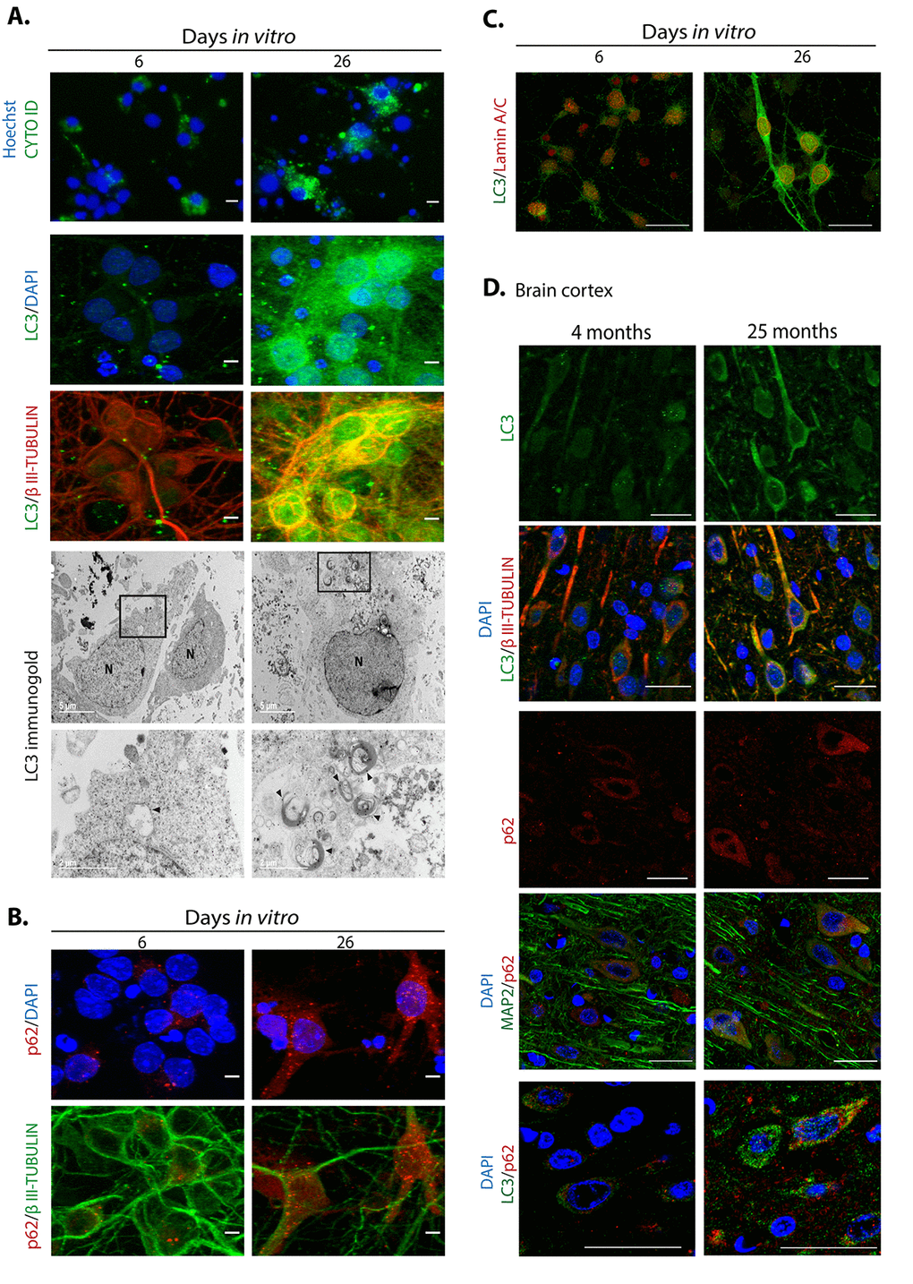 Abundant reports indicate that dysfunctional autophagy accompanies aging, and in the brain it causes neurodegeneration [29]. Accordingly, induction of autophagy ameliorates age-related cognition deficits [30]. Therefore, we evaluated whether dysfunctional autophagy would contribute to neuronal senescence establishment, with a similar mechanism as described for senescence transition of mitotic cells. First, we analyzed in senescent neurons whether autophagic flux is reduced, reflected by accumulation of autophagosomes and proteins associated to them like LC3 and p62/SQSTM1. As shown in Figure 7A, cortical cells at 26 DIV, a time point when neurons showed senescent features, had more autophagosomes detected with the specific dye CytoID® and by immunofluorescent detection of LC3. We confirmed the abundance of autophagosomes in senescent neurons by electron microscopy, labeling them with immunogold localization of LC3. As the autophagic receptor p62/SQSTM1 is degraded together with the cargo, it accumulates when the autophagic flux is interrupted. We analyzed the abundance of p62/SQSTM1 by immunofluorescence (Figure 7B) and Western blot (Figure 8B), and we found that it was also accumulated in neurons at 26 DIV. To determine whether indeed senescent cells had more autophagosomes, we simultaneously detected LC3 and Lamin-A/C. As shown in Figure 7C, the same cells that had intranuclear folds of the nuclear envelop with Lamin-A/C at 26 DIV had LC3 accumulation (Figure 7C). Importantly, both LC3 and p62/SQSTM1 also accumulated in cortical neurons of old rat brains (Figure 7D). The accumulation of both autophagosomes and p62/SQSTM1 suggests dysfunctional lysosomes or impairment of the fusion of autophagosomes with lysosomes. We stained lysosomes with Lysotracker® and observed an accumulation of enlarged lysosomes in senescent cortical cells (Figure 8A), as it has been described in another model of neuronal senescence [21]. We confirmed altered lysosomal morphology by localizing the lysosomal protein LAMP1; we noticed that abundant p62/SQSTM1 puncta did not co-localize with LAMP1 at 26 DIV (Figure 8A), suggesting limited autolysosome maturation (i.e. reduced autophagosome-lysosome fusion), although further studies are needed to corroborate it.