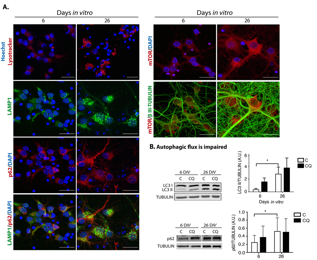 p62/SQSTM1 accumulates when autophagy promotes the SASP through a compartmentalized structure coined TASCC (Tor-autophagy spatial coupling compartment), which is where amino acids released by autolysosomes locally activate mTORC1, facilitating the synthesis of SASP proteins. The TASCC can be distinguished by the polarized co-localization of p62/SQSTM1, mTOR and LAMP2 [11]. Therefore, we analyzed whether during neuronal senescence these proteins were also distributed in a similar polarized intracellular localization (we observed LAMP1 instead of LAMP2). As can be seen in Figure 8A, neither the distribution of p62/SQSTM1 nor mTOR indicated a compartmentalized distribution. Even though lysosomes seemed to be mainly located on one side of the cells, it might reflect only the particular morphology of this type of cells, which have the cytoplasm mostly on one side of the cell. Therefore, we found no evidence of a TASCC during neuronal senescence, indicating that autophagy dysfunction, rather than function, accompanies neuronal senescence. To verify that the observed accumulation of autophagosomes was due to an impaired autophagic flux, instead of an enhanced activation of autophagy, cortical cells were incubated in the presence of Chloroquine, an agent that neutralizes lysosomes pH and impairs autophagosomes fusion with lysosomes. As shown in Figure 8B, the presence of Chloroquine did not increase the amount of LC3-II or p62/SQSTM1 accumulation at 26 DIV, indicating that the autophagic flux was already diminished in senescent neurons.