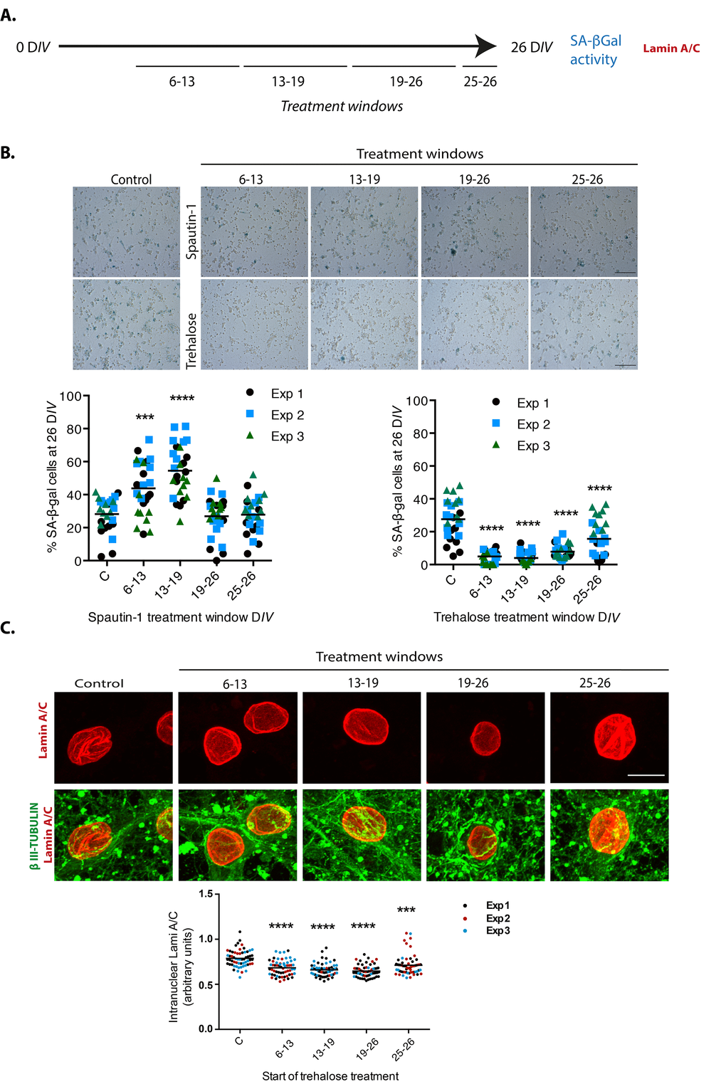 If a limited autophagic flux contributes to neuronal senescence, we would expect more senescent cells when autophagy is inhibited. Since basal autophagy is essential for survival, inhibition of autophagy by genetic means along the time of culture kills the neurons. Therefore, we inhibited autophagy only at distinct time windows (7 days long each) by adding Spautin-1, a molecule that indirectly induces BECN1 and PtdIns-3-kinase type 3/VPS34 (PI3KC3) degradation [31]. As shown in Figure 9B, we found that the number of cells with SA-β-gal activity increased when autophagy was inhibited during the second or third weeks of culture. When Spautin-1 was added at the fourth week of culture or later, it had no effect increasing the number of cells with SA-β-gal activity, suggesting that autophagy was already dysfunctional at this time. On the other hand, stimulating autophagy with trehalose, a disaccharide that mimics caloric restriction by preventing glucose uptake [32], reduced the number of cortical cells with SA-β-gal activity regardless of the time window of exposure, although a more noticeable protection was observed during the second and third weeks of culture. As a control to verify the function of Spautin-1 in neurons, we verified the reduction in the number of autophagosomes in cortical cells at 26 DIV, when we had previously observed abundant autophagosomes. We also tested that trehalose stimulates autophagy in neurons by detecting more autophagosomes in cortical cells at 6 DIV, which time we had observed neurons have a reduced amount of autophagosomes (Supplementary Figure 2S). To confirm that trehalose induction of autophagy indeed reduced the senescent phenotype and not just SA-β-gal activity, we repeated the experiment now immunodetecting Lamin-A/C to evaluate whether the intranuclear folds were reduced. As shown in Figure 9C, adding trehalose during one week windows statistical significantly reduced the degree of intranuclear Lamin-A/C folds. These results suggest that autophagy induction prevents senescence conversion and potentially reverts the senescent phenotype, although further experiments will be needed to address the latter.