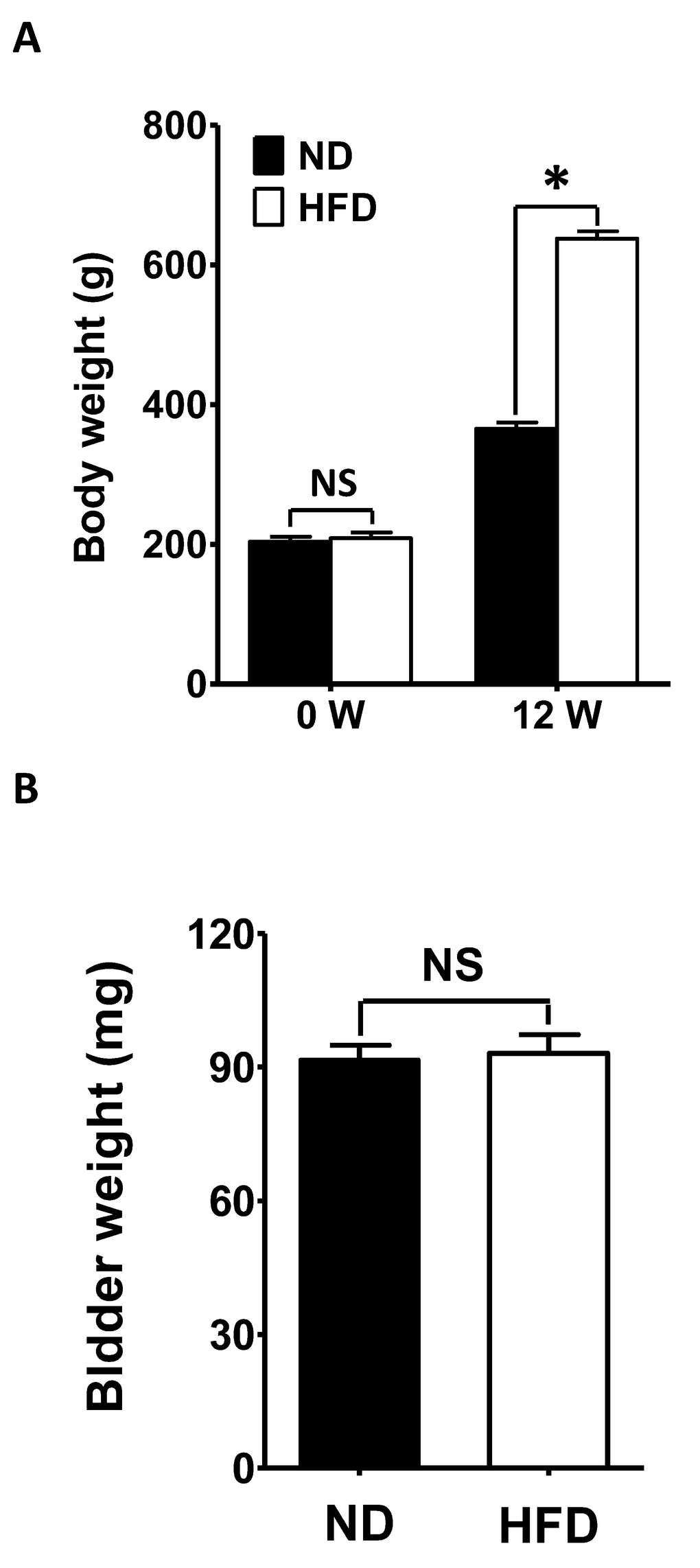 The average weight before feeding did not differ significantly between rats fed a HFD or a normal diet (ND) (HFD 203.81 ± 7.22 g, N = 40; ND 208.72 ± 8.31 g, N = 40; P > 0.05; Figure 1A). However, after 12 weeks, the average bodyweight of the HFD rats (637.83 ± 10.51 g, N = 40) was significantly greater than that of the ND animals (365.29 ± 9.17 g, N = 40; P < 0.05; Figure 1A). On the other hand, the mean bladder weight did not differ significantly between the groups after 12 weeks (ND 91.71 ± 3.23 mg, N = 40; HFD 93.09 ± 4.24 mg, N = 40; P > 0.05; Figure 1B).