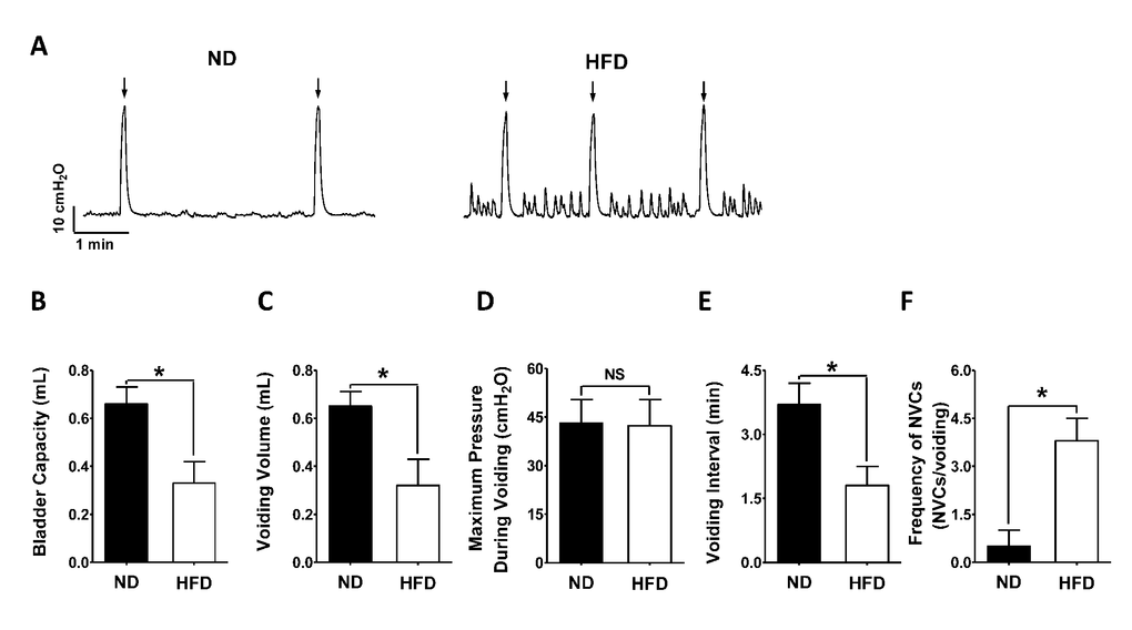HFD-induced changes in urodynamic parameters of the rat urinary bladder were measured by cystometry (Figure 2A–2F). Twelve weeks after the initiation of HFD feeding, HFD rats exhibited a lower bladder capacity than ND rats (HFD 0.33 ± 0.09 mL, N = 10; ND 0.66 ± 0.07 N = 10; P < 0.05; Figure 2A, 2B), with a significant reduction in voiding volume (HFD 0.32 ± 0.11 mL, N = 10; ND 0.65 ± 0.06 mL, N = 10; P < 0.05; Figure 2A, 2C). The maximum pressure during voiding did not differ significantly between the ND (43.18 ± 7.21 cm H2O, N = 10) and HFD (42.31 ± 8.13 cm H2O, N = 10; P > 0.05; Figure 2A, 2D) rats. However, in HFD rats, the voiding interval was significantly shorter (HFD 1.83 ± 0.45 min, N = 10; ND 3.73 ± 0.47 min, N = 10; P < 0.05; Figure 2A, 2E) and non-voiding contractions were more frequent than in ND rats (HFD 3.79 ± 0.67, N = 10; ND 0.51 ± 0.47, N = 10; P < 0.05; Figure 2A, 2F), indicating that detrusor overactivity had been induced.