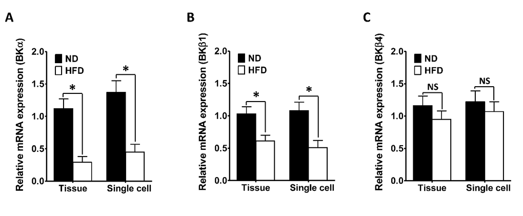 The mRNA levels of the Kcnma1 and Kcnmb1 are significantly lower in the DSM of HFD rats