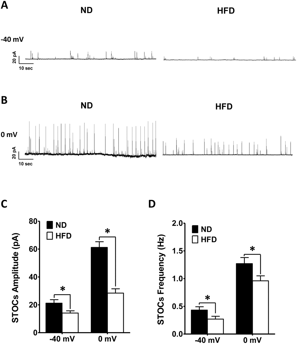 The activation of BK channels can induce STOCs, which contribute to the hyperpolarization of the DSM cell membrane potential and prevent the firing of spontaneous action potentials that cause phasic contractions [17, 20, 21]. We used a perforated patch clamp to record STOCs from the DSM at membrane potentials of 0 mV and −40 mV. The average DSM cell capacitance did not differ significantly between the ND (27.31 ± 1.22 pF; n = 21, N = 12) and HFD (26.62 ± 1.52 pF; n = 21, N = 11; P > 0.05) groups.