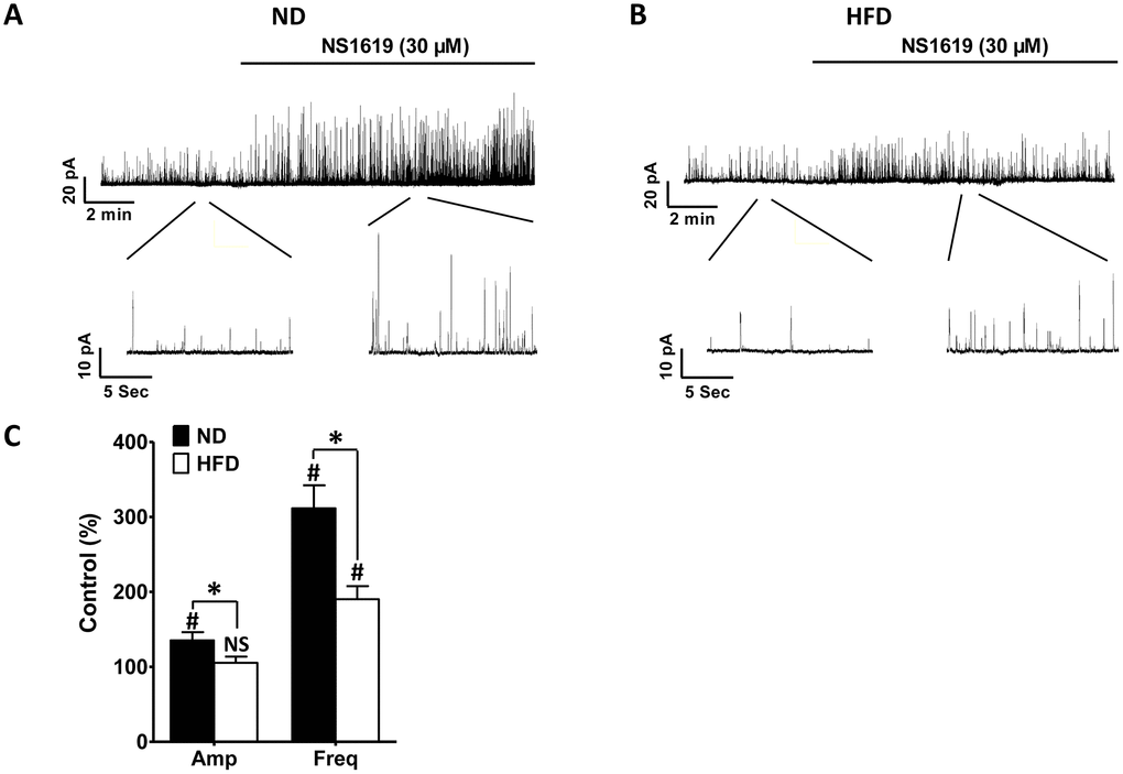 In another set of experiments, NS1619, a selective BK channel activator, was applied to stimulate STOC activity in HFD DSM cells at a holding potential of −40 mV, which is very close to the physiologic membrane potential of intact DSM cells [21, 31]. In HFD DSM cells, NS1619 (30 μM) increased the frequency of STOCs to 190.21 ± 17.42% of the control values (n = 7, N = 5; P < 0.05; Figure 5B, 5C) without significantly changing the average amplitude of the STOCs (n = 7, N = 5; P > 0.05; Figure 5B, 5C). However, in the ND group, both the amplitude and frequency of STOCs were significantly enhanced to 135.42 ± 10.91% and 311.47 ± 30.61% of control activity, respectively, after the application of NS1619 (30 μM) (n = 7, N = 5; P < 0.05; Figure 5A, 5C). A weaker activating effect of NS1619 (30 μM) on STOCs was detected in HFD DSM cells than in ND DSM cells (P < 0.05; Figure 5C). Thus, DSM cells from HFD rats presented with weaker STOC activity than those from ND animals.