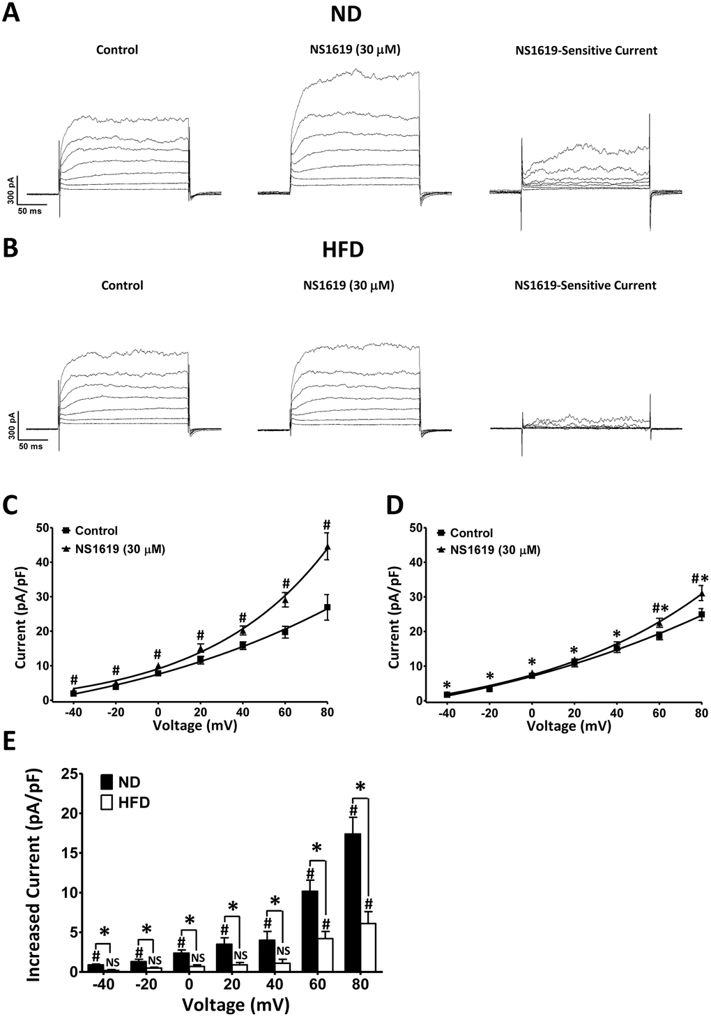 It was previously demonstrated that an NS1619-sensitive whole-cell current occurs due to the activation of BK channels in DSM cells [15]. We applied a depolarizing voltage-step protocol at a holding potential of −70 mV to determine whether the NS1619-sensitive whole-cell BK current was altered in HFD animals. The average DSM cell capacitance did not differ significantly between the ND (26.31 ± 1.22 pF; n = 12, N = 7) and HFD (26.87 ± 1.38 pF; n = 12, N = 8; P > 0.05) groups. The current-voltage relationships illustrated that NS1619 significantly increased the whole-cell BK currents of DSM cells from both ND rats (n = 12, N = 7; P < 0.05; Figure 6A, 6C) and HFD rats (n = 12, N = 8; P < 0.05; Figure 6B, 6D). However, the NS1619-sensitive whole-cell BK currents were lower in HFD DSM cells than in ND DSM cells (P < 0.05; Figure 6E). Our voltage-clamp data indicated that the ability of BK channels to suppress DSM cell excitability was reduced in HFD rats.
