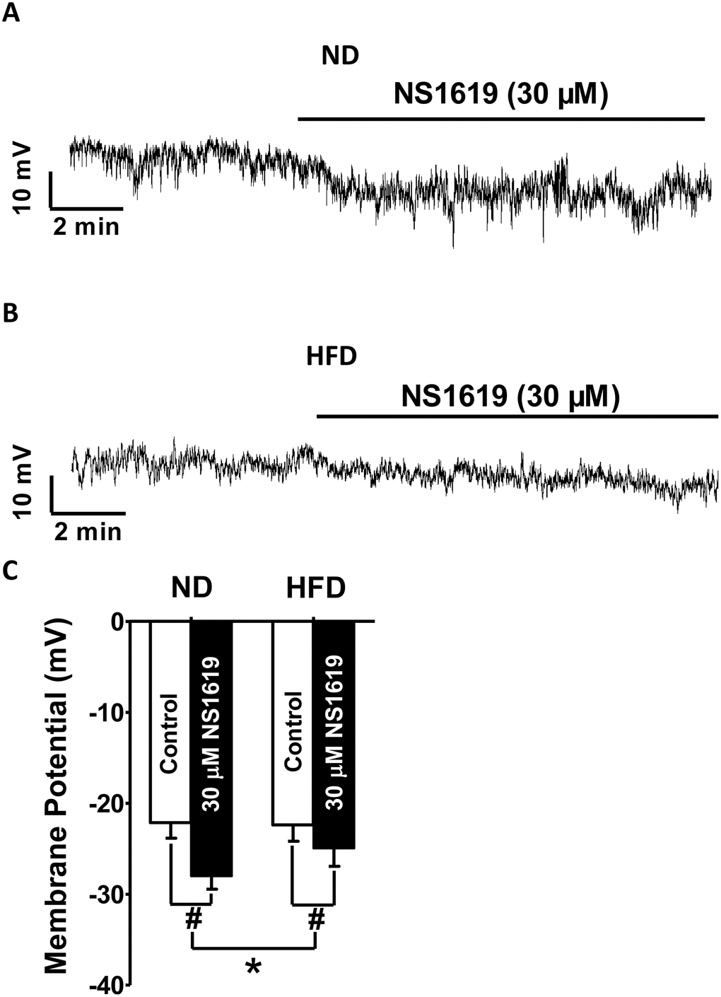 We next investigated whether HFD feeding for 12 weeks altered the ability of BK channels to hyperpolarize the membrane potential of DSM cells. The average DSM cell capacitance did not differ significantly between the ND (26.12 ± 1.09 pF; n = 8, N = 6) and HFD (27.17 ± 1.28 pF; n = 8, N = 6; P > 0.05) groups. In the absence of NS1619, the membrane potential did not differ significantly between the ND (n = 8, N = 6) and HFD (n = 8, N = 6; P > 0.05) groups. NS1619 (30 μM) significantly hyperpolarized the membrane potential from −22.12 ± 1.71 to −28.09 ± 1.41 mV in DSM cells from ND rats (n = 8, N = 6; P < 0.05; Figure 7A, 7C), and from −22.42 ± 1.81 to −24.91 ± 1.89 mV in DSM cells from HFD animals (n = 8, N = 6; P < 0.05; Figure 7B, 7C). However, the NS1619-induced hyperpolarization effect was smaller in DSM cells from HFD rats (2.82 ± 0.51 mV; n = 8, N = 6) than in DSM cells from ND rats (5.81 ± 0.69 mV; n = 8, N = 6; P < 0.05; Figure 7A–7C). Our current-clamp data established that HFD feeding attenuated the ability of BK channel activation to hyperpolarize the membrane potential of DSM cells.