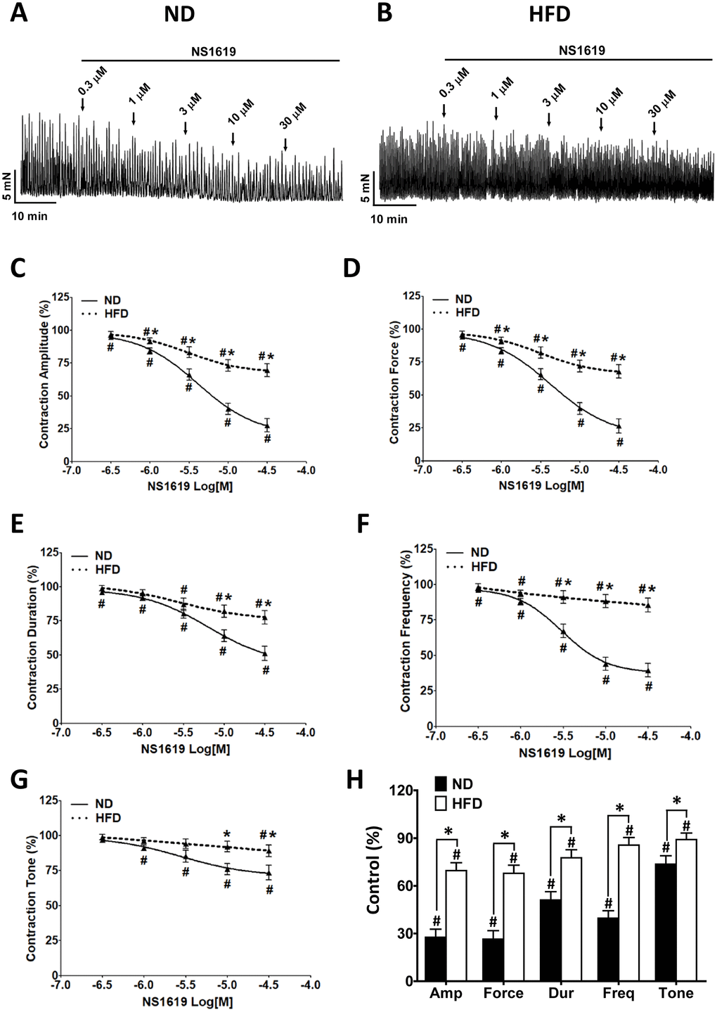 Our previous studies indicated that changes in DSM cell excitability can alter DSM contractility [13, 14]. In the present study, the pharmacological activation of BK channels with NS1619 (0.3-30 μM) dose-dependently relaxed the spontaneous phasic contractions in both groups (HFD n = 11, N = 7, P < 0.05; ND n = 11, N = 8, P < 0.05; Figure 8A–8G). However, consistent with the patch-clamp data, the inhibitory effect of NS1619 on the contractility of DSM strips was lower in HFD rats than in ND rats (Figure 8A–8H). At the highest concentration of NS1619 applied (30 μM), the amplitude was reduced to 27.61 ± 5.09% vs. 69.62 ± 4.91% of the control value (ND vs. HFD), the muscle integral force was reduced to 26.49 ± 5.29% vs. 67.91 ± 5.12%, the duration was reduced to 51.12 ± 5.21% vs. 77.62 ± 4.89%, the frequency was reduced to 39.63 ± 4.71%vs. 85.62 ± 4.84% and the tone was reduced to 73.62 ± 5.31%vs. 89.12 ± 4.09% (ND vs. HFD, respectively; P < 0.05; Figure 8H).