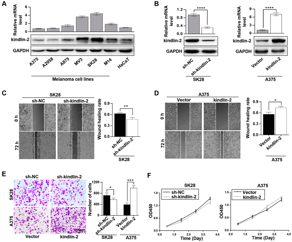 The recognized role of kindlin-2 was examined first. Through qRT-PCR and western blotting analyses, we found that kindlin-2 was differentially expressed in different melanoma cell lines, which showed a highly heterogeneity of melanoma. Among them, kindlin-2 was overexpressed in four of six melanoma cell lines compared with HaCaT, a normal skin cell line (Figure 1A). Then, the short hairpin RNA (shRNA) lentivirus vector of kindlin-2 was transfected into SK28 cells, and the kindlin-2 cDNA vector was transfected into A375 cells (Figure 1B). Through wound-healing migration and Matrigel invasion assays, we found that high levels of kindlin-2 promoted migration and invasion, while low levels of kindlin-2 inhibited migration and invasion of melanoma cells (Figure 1C–1E). However, we found that kindlin-2 had no influence on the proliferation of melanoma cells analyzed by CCK-8 assays (Figure 1F). Together, we found that high levels of kindlin-2 promote cellular invasion and migration in melanoma.