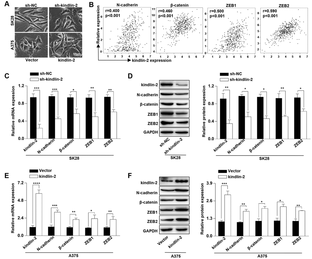 Kindlin-2 has been reported to induce the tumour cellular EMT [18–19]. Through a phase-contrast microscopy, we found that SK28-shNC and A375-kindlin-2 cells presented spindle-like, fibroblastic morphologies compared with SK28-sh-kindlin-2 and A375-Vector cells, which joined closely like epithelial cells (Figure 2A). Then we performed correlation analyses between the expression of kindlin-2 and EMT markers through the TCGA database, and found a positive correlation between kindlin-2 and N-cadherin (p < 0.001, r = 0.400), β-catenin (p < 0.001, r = 0.460), ZEB1 (p < 0.001, r = 0.500), and ZEB2 (p < 0.001, r = 0.590) (Figure 2B). Through qRT-PCR and western blot analyses, we confirmed that high levels of kindlin-2 increased, while low levels of kindlin-2 decreased the mRNA and protein levels of N-cadherin, β-catenin, ZEB1 and ZEB2 (Figure 2C–1F). These results show that elevated kindlin-2 promotes the cellular EMT in melanoma.