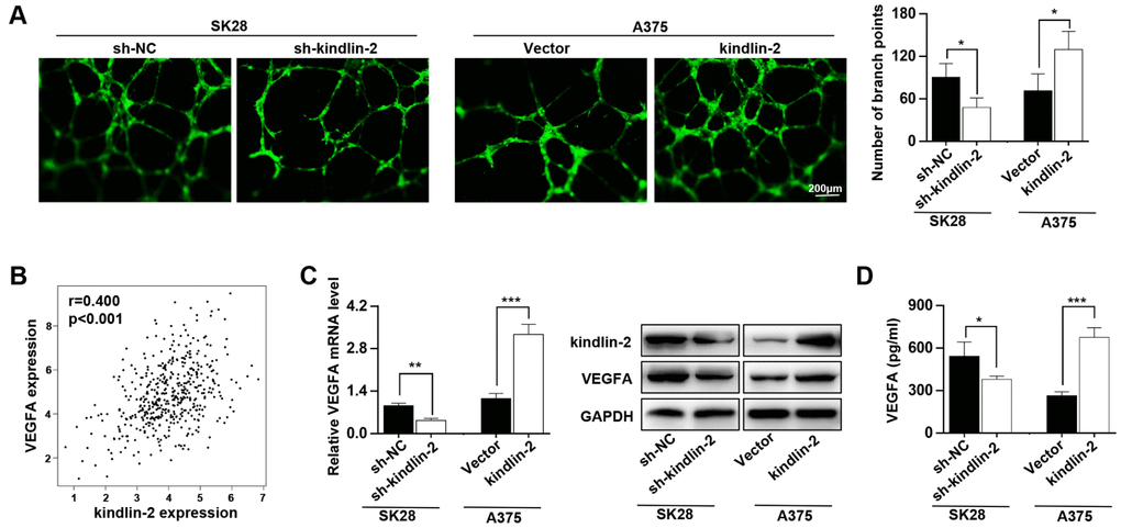 Our previous study showed that kindlin-2 affects neovascular permeability [20], and here, we detected whether its expression in melanoma cells had an effect on angiogenesis. We found that kindlin-2 overexpression in melanoma cells promoted vascular formation and that the downregulation of kindlin-2 inhibited vascular formation (Figure 3A). As the secretory protein VEGFA plays an important role in angiogenesis, we examined the relationship between the expression of kindlin-2 and VEGFA through TCGA database, and a positive correlation was observed (p < 0.001, r = 0.400, Figure 3B). Through qRT-PCR, western blot and ELISA analyses, we further showed that high levels of kindlin-2 increased the expression and secretion of VEGFA (Figure 3C, 3D). Thus, we conclude that high levels of kindlin-2 promote the secretion of VEGFA and vascular formation.