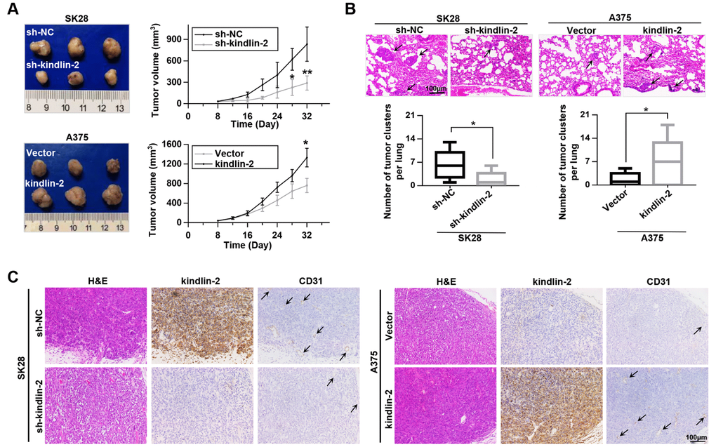 Since angiogenesis plays an important role in tumour progression [21], we constructed subcutaneous tumourigenesis and lung metastasis models to examine the role of kindlin-2 in tumour progression. Through the subcutaneous tumourigenesis model, we found that high levels of kindlin-2 promoted tumour growth, while low levels of kindlin-2 inhibited tumour growth (Figure 4A). Similarly, kindlin-2 over-expression increased, while kindlin-2 knockdown inhibited lung metastasis examined by a lung metastasis model (Figure 4B). Additionally, IHC staining on the serial sections showed that subcutaneous tumours with overexpressed kindlin-2 had increased vascular density and vice versa, which further confirmed that melanoma cells with kindlin-2 upregulation promotes tumoural angiogenesis. (Figure 4C). Thus, we showed that upregulated kindlin-2 promotes melanoma progression in vivo.