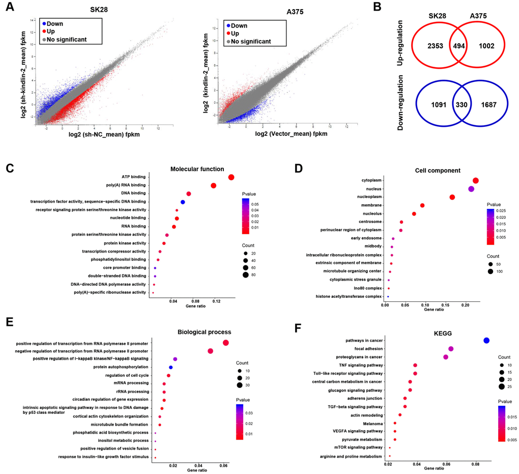 To unveil the underlying mechanism of kindlin-2 induced melanoma progression, we performed the gene expression profiles according to the differentially expressed kindlin-2 (Figure 5A). There were 2847 upregulated DEGs and 1421 downregulated DEGs in SK28-shNC cells compared with SK28-sh-kindlin-2 cells, while there were 1496 upregulated DEGs and 2017 downregulated DEGs in A375-kindlin-2 cells compared with A375-Vector cells. Among them, 824 DEGs overlapped, including 494 upregulated DEGs and 330 downregulated DEGs (Figure 5B). According to Gene Ontology (GO) analysis, the overlapped DEGs were classified into three groups: biological process (BP), molecular function (MF), and cellular component (CC). The main MF categories that were enriched included ATP binding, polyA RNA binding, DNA binding, and receptor signalling protein serine/threonine kinase activity (Figure 5C). Within the CC group, the overlapping DEGs were mainly involved in the cytoplasm, nucleus and nucleoplasm (Figure 5D). For BP, the overlapping DEGs were enriched in both the positive and negative regulation of transcription from the RNA polymerase II promoter, the positive regulation of I−κB kinase/NF−κB signalling and protein autophosphorylation (Figure 5E). Additionally, KEGG analysis revealed that the overlapping DEGs were involved in pathways in cancer, focal adhesion, proteoglycans in cancer, TGF-β signalling pathway and so on, all of which are known functions of kindlin-2 (Figure 5F). Interestingly, we also found that the overlapping DEGs were enriched in mTOR and VEGFA signalling pathways, which have not been reported and deserve further verification.