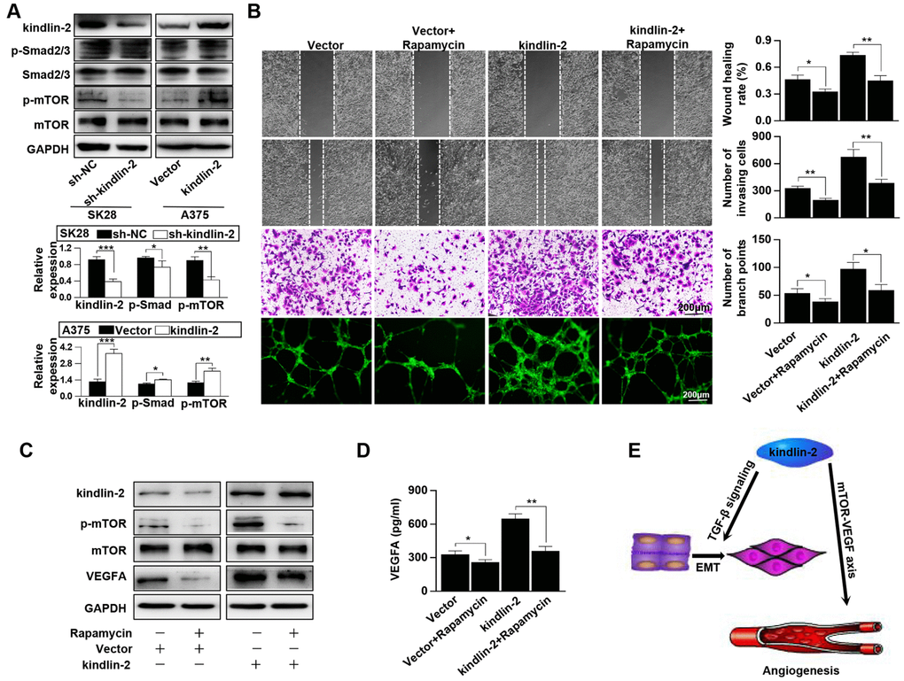 According to the results of KEGG, we performed western blotting and found that high levels of kindlin-2 slightly upregulated, while low levels of kindlin-2 slightly downregulated the p-Smad2/3 level. The results indicated that over-expressed kindlin-2 activates the TGF-β pathway, which confirmed the reliability of the NGS results. What’s more, we detected that high level of kindlin-2 increased the p-mTOR level, and that low level of kindlin-2 decreased its level (Figure 6A). Through specific inhibitor, we found that kindlin-2-induced migration, invasion, and vascular formation were reversed by rapamycin (mTOR pathway inhibitor, 100 nM, 24 h, Figure 6B). Furthermore, we found that kindlin-2-induced high levels of p-mTOR and VEGFA secretion were also reversed by rapamycin (Figure 6C, 6D). Together, we conclude that kindlin-2 promotes angiogenesis and tumour progression via mTOR signalling (Figure 6E).