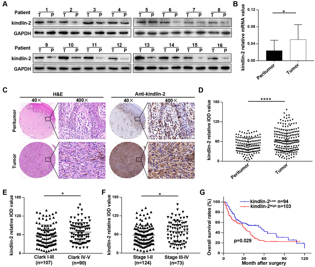 Clinically, we found that kindlin-2 was overexpressed in tumour tissues compared with peritumour tissues in sixteen melanoma patients at both mRNA and protein levels (Figure 7A, 7B). Typical IHC images indicated that kindlin-2 was mainly expressed in the cytoplasm but partially expressed in the nucleus (Figure 7C). Through quantification, we further confirmed that kindlin-2 was overexpressed in melanoma tissues compared with paired normal tissues (Figure 7D). Then, patients were divided into two groups according to the Clark level and clinical stage. We found that high kindlin-2 levels were more common in melanoma tissues with advanced Clark levels (p=0.027, Figure 7E) and clinical stages (p=0.011, Figure 7F). Importantly, patients in the kindlin-2High group (n=103) had poorer overall survival rates than those in the kindlin-2Low group (n=94) (p=0.029, Figure 7G). Thus, kindlin-2 is overexpressed in melanoma tissues, and high levels of kindlin-2 predict poor prognoses.