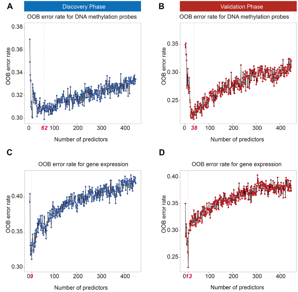 In total, 719 cancer-related genes from COSMIC and its corresponding 12,806 DNA methylation probes were used in this study. Ranger screened out 62 DNA methylation probes in the discovery phase according to variable importance score (VIS) (Figure 1A). Further, 38 DNA methylation probes were retained in the validation phase using the same method (Figure 1B). There were 27 overlapping DNA methylation probes between the phases, which were further analyzed by multi-Cox regression simultaneously. The 12 DNA methylation probes were significantly associated with prognosis after correction for multiple comparisons (Supplementary Table 1).