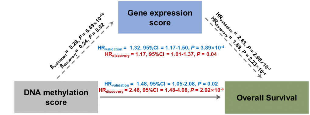 To detect the potential mechanism by which DNA methylation affects overall survival (OS), all pairwise DNA methylation–gene expression–LUAD survival pathways were evaluated, with a consideration of trans- and cis- regulation patterns between DNA methylation and gene expression. We observed six potential causal pathways that were significant in both phases (Supplementary Table 3). Further, we calculated DNA methylation risk score (MRS) and gene expression risk score (GRS) by weighted linear combination of biomarkers using ln(HRadjusted) as weights. As a result, the effect of MRS on survival was significantly mediated through GRS in both phases (discovery: HRindirect = 1.17, 95% CI = 1.01–1.37, P = 0.04, proportion mediated: 32.2%; validation: HRindirect = 1.32, 95% CI = 1.17–1.50, P = 3.89×10−4, proportion mediated: 47.1%) (Figure 2).