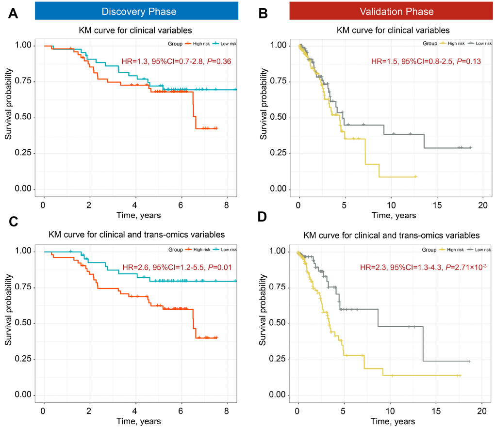 We used the iCluster plus machine learning approach using a joint latent variable model for fusing clinical variables (age, gender, smoking status, and clinical stage) and trans-omics biomarkers (12 DNA methylation and 7 gene expression probes) to explore the classification ability of these predictors. We compared (i) clinical classifiers with (ii) clinical and trans-omics classifiers. Clinical information only was insufficient to discriminate patients into high- and low-mortality groups in both discovery and validation phases (HRdiscovery = 1.32, 95% CI = 0.78–2.81, Pdiscovery = 0.363; HRvalidation = 1.52, 95% CI = 0.86–2.53, Pvalidation = 0.136) (Figure 3A, 3B). However, adding DNA methylation and gene expression biomarkers resulted in significantly different survival curves between the two groups in both phases (HRdiscovery = 2.67, 95% CI = 1.26–5.53, Pdiscovery = 0.011; HRvalidation = 2.32, 95% CI = 1.32–4.31, Pvalidation = 2.71×10−3) (Figure 3C, 3D), indicating good discrimination performance of the trans-omics biomarkers panel.