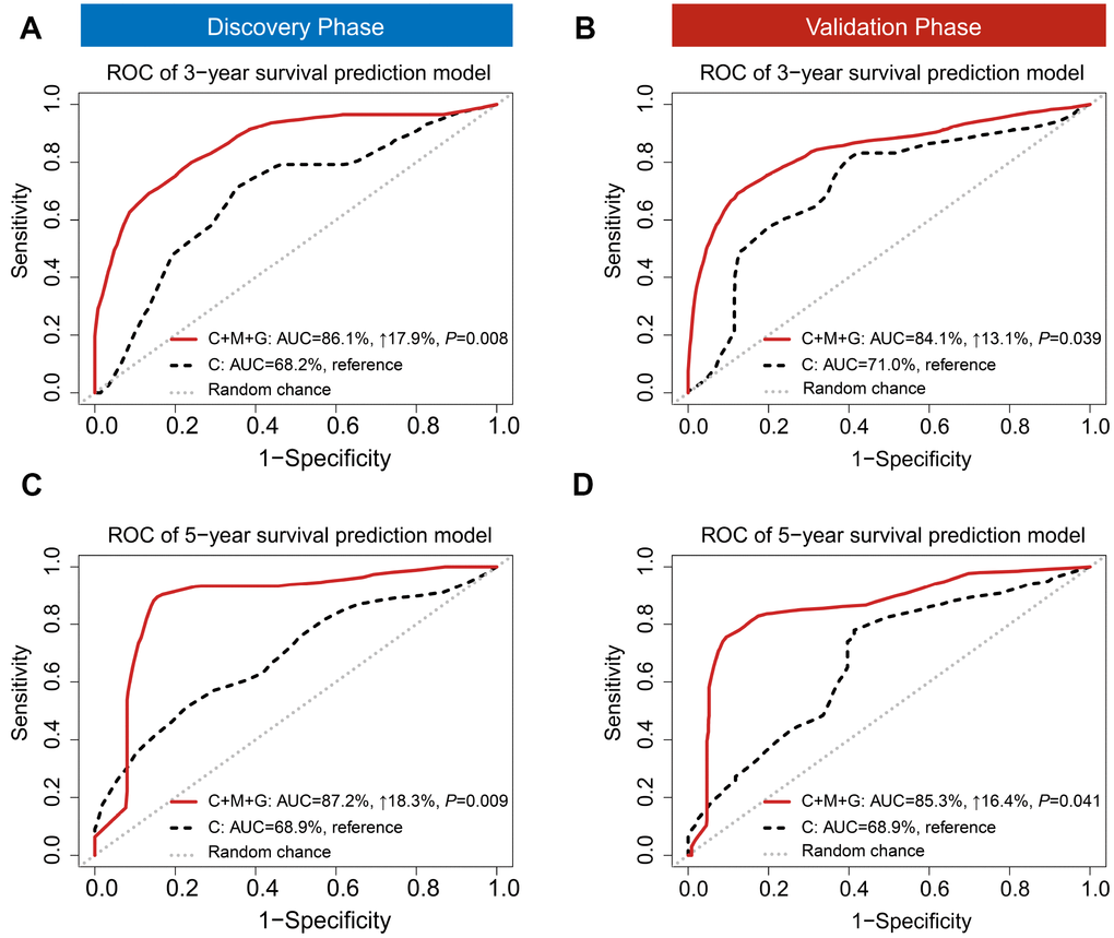 Besides discrimination, we used two prediction models (i) a clinical model, and (ii) a trans-omics model (clinical + MRS + GRS) to predict 3- and 5-year survival, which are the two important clinical prognostic outcomes. A risk score model was constructed with a linear combination of predictable factors weighted by the multi-Cox coefficient. Compared to the model including clinical information only, the trans-omics model significantly improved prediction accuracy in the discovery phase, with AUCs up to 86.1% for 3-year (AUC3-year: 17.9% increase, P = 0.008) (Figure 4A) and 87.2% for 5-year survival prediction (AUC5-year: 18.3% increase, P = 0.009) (Figure 4C). The validation phase further confirmed a significant improvement in prediction with the trans-omics model, with AUCs up to 84.1% for 3-year (AUC3-year: 13.1% increase, P = 0.039) (Figure 4B) and 85.3% for 5-year survival prediction (AUC5-year: 16.4% increase, P = 0.041) (Figure 4D).