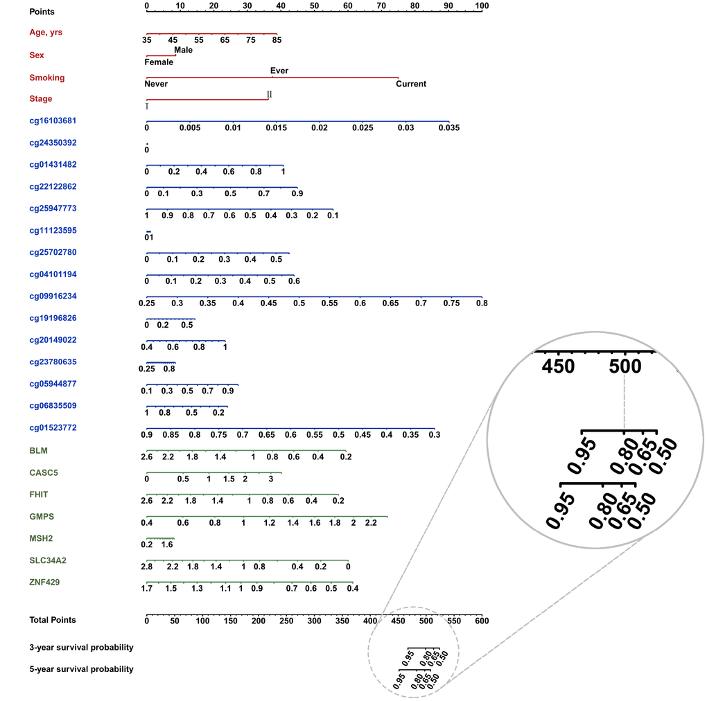 In conclusion, using a machine learning method and two-stage design, we built a prediction model incorporating 12 DNA methylation probes and 7 gene expression probes. These 19 molecular predictors provide perspective to design a cost-effective chip that can detect biomarkers exclusively for early-stage LAUD prognosis prediction, which will benefit both physicians and patients in clinical applications.