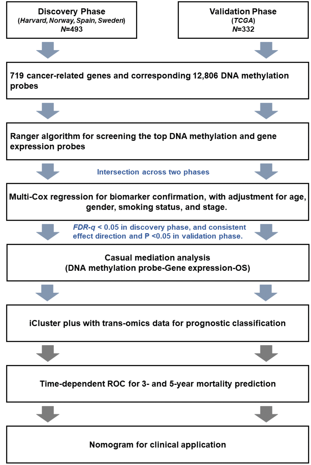 In this study, all significant results in the discovery phase were further independently confirmed in the validation phase. Patients (n = 493) from Harvard, Spain, Norway, and Sweden were assigned to the discovery phase. Patients (n = 332) from TCGA were assigned to the validation phase. The work flow chart is shown in Figure 6. First, ranger, an improved version of random forest incorporating adjustment of covariates, was used to evaluate importance of each DNA methylation probe based on VIS [32]. All DNA methylation probes were ranked by VIS in descending order. The sliding windows sequential forward feature selection method was applied to identify top important probes, which means probes were sequentially included in the model as predictors until the model reached the minimum out of bag (OOB) error rate [42]. We screened out important probes in the discovery and validation phases. Overlapping probes in both phases were retained for subsequent analysis. The same pipeline was also used to screen out important gene expression variables. Second, a multivariate Cox regression model was further used to confirm the association between each biomarker and survival with adjustment for age, gender, clinical stage, smoking status, and study center. Hazard ratio (HR) and 95% confidence interval (CI) were described per 1% methylation increment. Multiple comparison correction was performed using the false discovery rate (FDR) method by Benjamini-Hochberg procedure. Biomarkers with FDR-q ≤ 0.05 in the discovery phase and P ≤ 0.05 in the validation phase, as well as consistent effect directions across both phases, remained for further analysis. Third, we performed a causal mediation analysis to explore possible “DNA methylation → gene expression → LUAD survival” pathways [43]. Adjusting for the same covariates as above, the total effect of methylation on survival (HRtotal) was separated into indirect effects (HRindirect), representing the effect of methylation on survival mediated through gene expression, and direct effects (HRdirect), representing the effect of methylation on survival directly. Fourth, we used an iCluster plus algorithm that integrated clinical and trans-omics biomarkers to distinguish patients with high- and low-mortality risk groups [33, 44]. Kaplan-Meier curves and log-rank test were used to assess survival differences between groups. Fifth, we integrated clinical and trans-omics biomarkers into a Cox regression model, and time-dependent receiver operating characteristic (ROC) curves were used to measure prediction performance for 3- and 5-year survival [45]. Area under ROC (AUC) of the prediction model with or without trans-omics biomarkers was compared using bootstrap with 1000 times resampling. Finally, nomogram plots were generated, and the validation was tested by discrimination and calibration in both phases. Discrimination was estimated by concordance index (c-index), which ranges from 0.5 (completely random) to 1.0 (perfect discrimination). Calibration assesses how close the nomogram-estimated risk is to observed risk, which was depicted by a calibration plot. Bootstrap analyses with 1000 resamples were used for these analyses. All data were analyzed using R version 3.4.4 statistical software (The R Foundation).