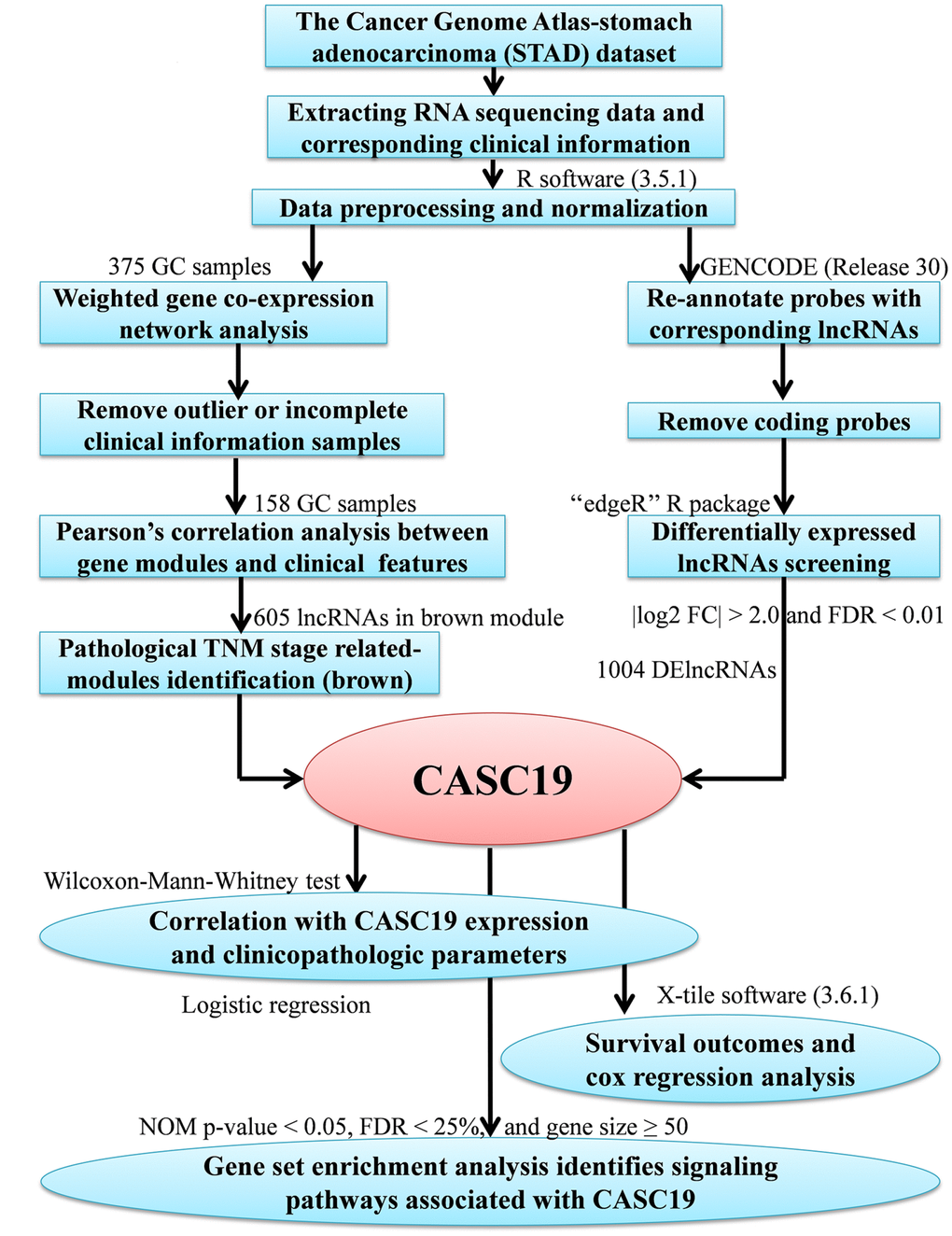 We applied an innovative genomic analysis method that combined differential lncRNAs expression analysis with WGCNA, and evaluated RNA sequencing data from The Cancer Genome Atlas (TCGA) to identify key lncRNAs associated with the development and progression of AGC. In addition, gene set enrichment analysis (GSEA) was conducted to explore signaling pathways related to key lncRNAs. Our results demonstrate the relevance of the hub lncRNA CASC19 as predictor of tumor stage and overall survival, and suggest CASC19 is a novel biomarker of AGC and a potential therapeutic target.