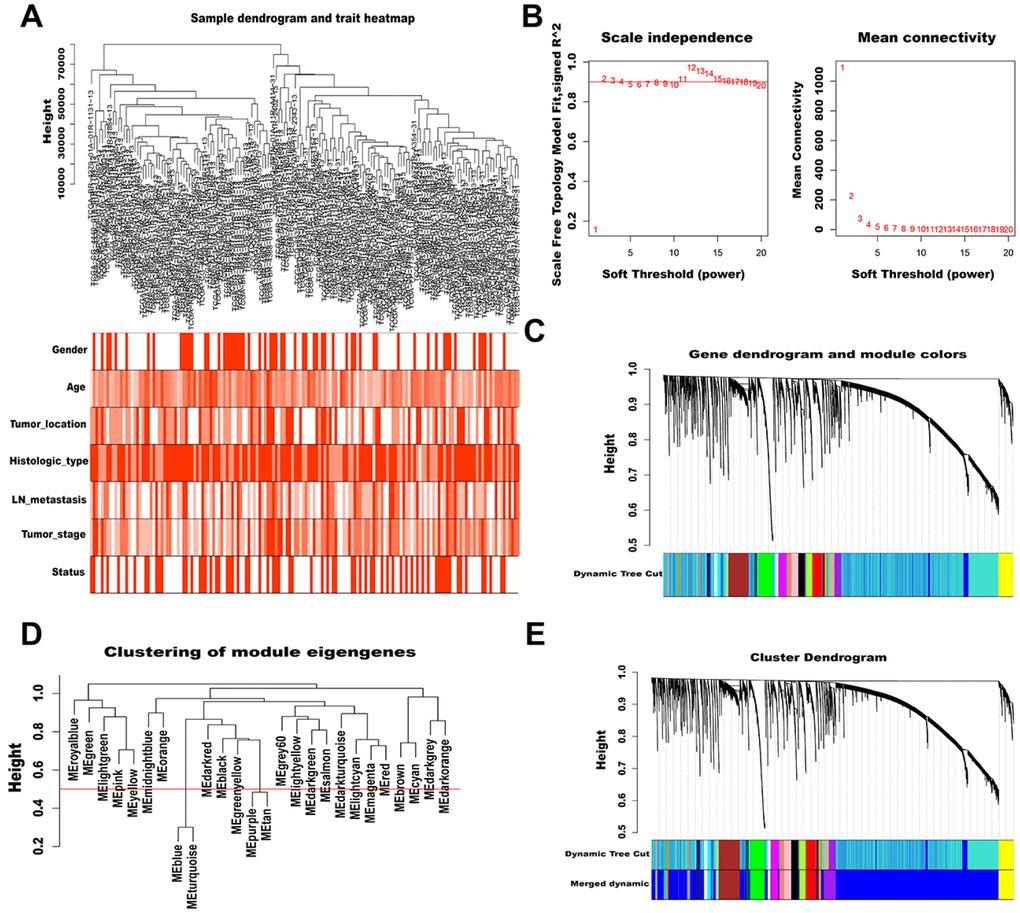 To characterize lncRNAs profiles in AGC, a co-expression network was constructed by WGCNA. After removing outlier samples and those with incomplete clinical information, 158 samples were used to construct an adjacency matrix (Figure 2A). We selected β = 2 as the soft thresholding power to ensure a correlation coefficient close to 0.9 (Figure 2B). Then, a total of 26 different color-coded co-expression modules were identified by the dynamic Tree Cut method, and minimum lncRNA number in each cluster tree was set to 60 (Figure 2C). After combining highly similar modules (MEDissThres = 0.5, Figure 2D), 24 modules were generated, each containing 60 to 6391 lncRNAs (Figure 2E).