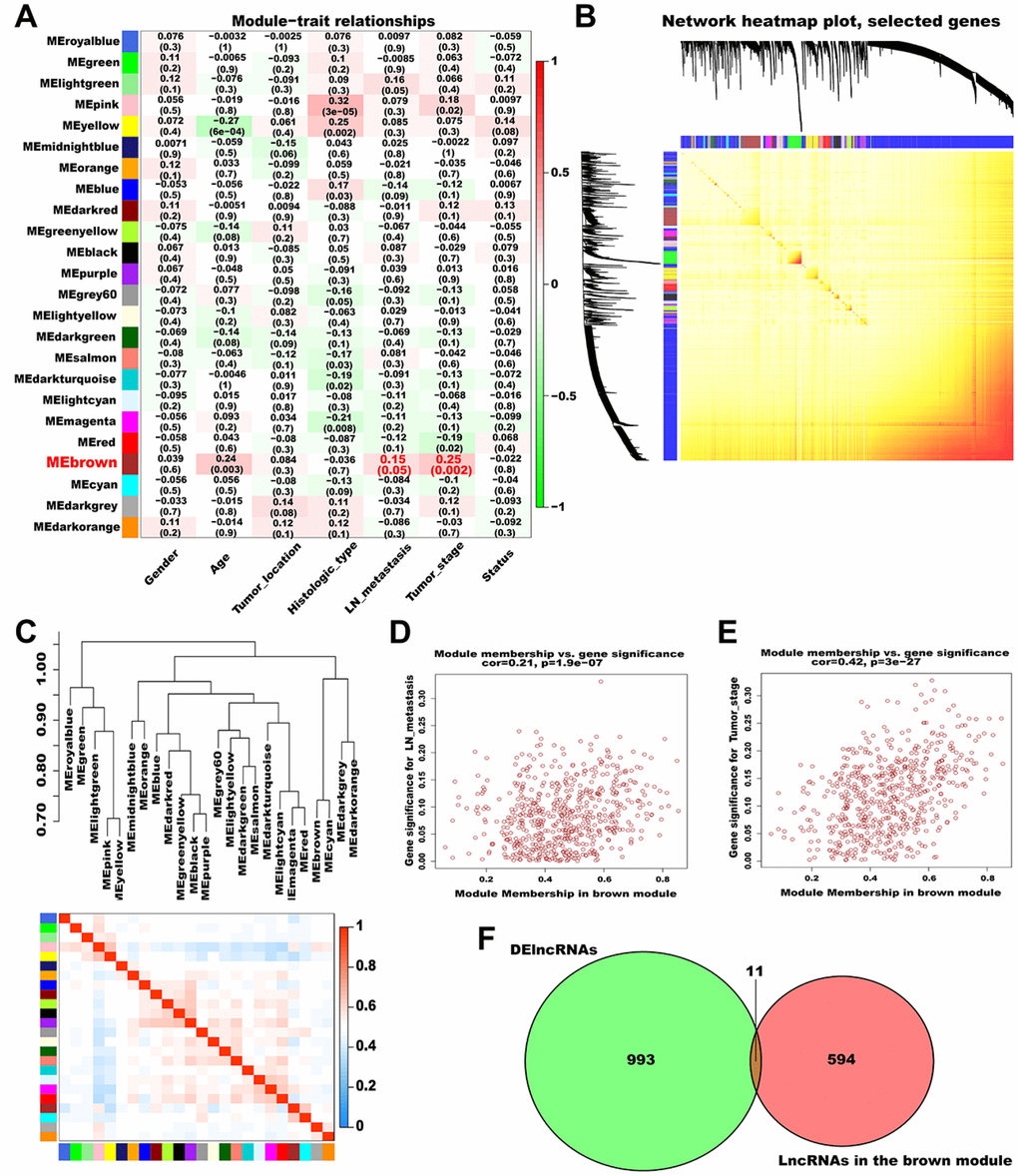Subsequently, we analyzed the association between the generated modules and AGC clinical features (Figure 3A). The brown module (contained 605 lncRNAs) was significantly correlated with lymph node (LN) metastasis and pathological TNM stage and was selected as a significant module for further analyses. A topological overlap matrix (TOM) plot showed that each module in the network was independent of each other, further indicating that gene expression in each module was also relatively independent (Figure 3B). Therefore, we explored the co-expression similarity of all modules using eigengenes and detected three main sub-clusters (Figure 3C). Besides, we generated scatter plots of module membership (MM) versus gene significance (GS) for LN metastasis and pathological TNM stage in the brown module, and a high correlation was obtained in all cases (LN metastasis: cor = 0.21, P = 1.9e-07; pathological TNM stage: cor = 0.42, P = 3e-27; Figure 3D and 3E).