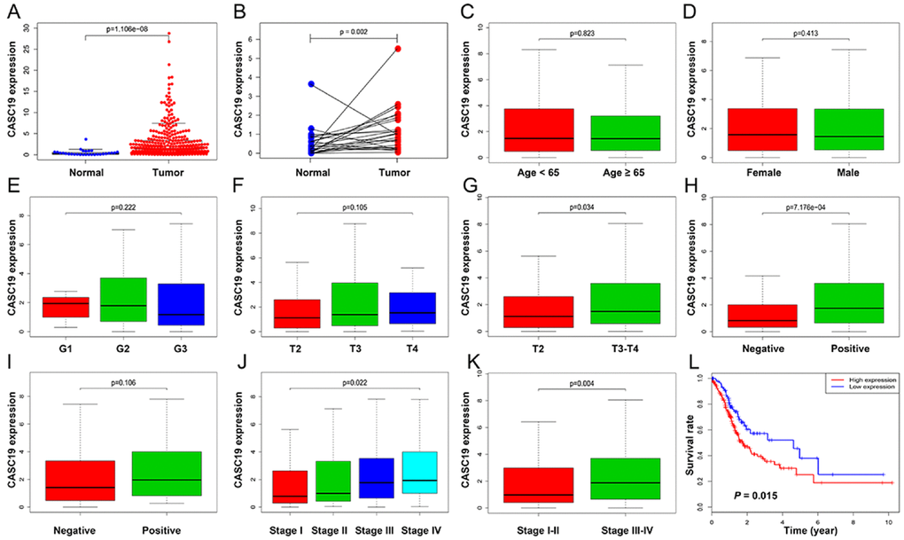 AGC patients with high CASC19 expression (≥ 0.57) had significantly worse prognosis than those with low CASC19 expression (< 0.57) for overall survival (Figure 4L, P = 0.015). Univariate Cox analysis showed that CASC19 expression was associated with shorter overall survival (low vs. high; Hazard Ratio [HR] = 1.637, 95% CI = 1.096-2.447, P = 0.016), and so were age (P = 0.016), pathologic TNM stage (P = 0.005), and LN metastasis (P = 0.036). Multivariable Cox analysis confirmed that CASC19 overexpression was an independent prognostic factor for overall survival (low vs. high; HR = 1.524, 95% CI = 1.003-2.316, P = 0.049; Table 3).