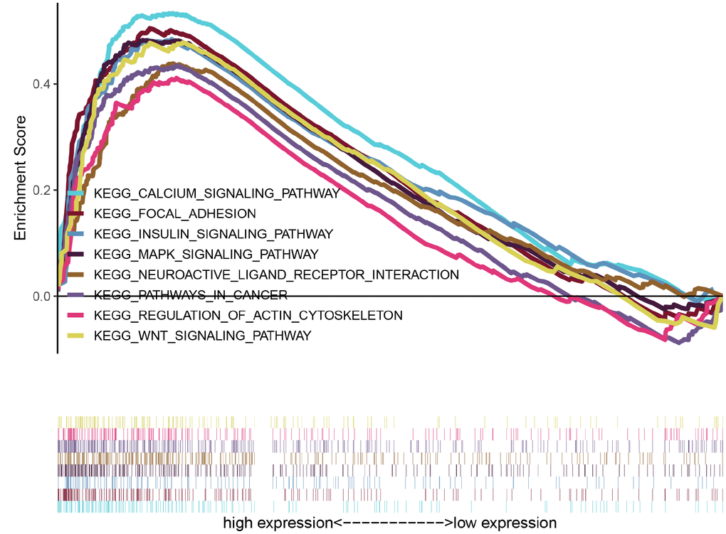 To explore potential signaling pathways relating CASC19 to AGC, GSEA was empolyed to identify Kyoto Encyclopedia of Genes and Genomes (KEGG) pathways enriched in AGC samples with high CASC19 expression. Results highlighted 30 enriched gene sets with Nominal (NOM) p < 0.05, FDR < 25%, and gene size ≥ 50. Interestingly, most of the gene sets are concentrated on ‘cancer-related’ and ‘classical signaling’ pathways. The top eight representative pathways were “pathways in cancer”, “neuroactive ligand receptor interaction”, “MAPK signaling pathway”, “regulation of actin cytoskeleton”, “focal adhesion”, “calcium signaling pathway”, “wnt signaling pathway” and “insulin signaling pathway” (Figure 5 and Supplementary Table 3).