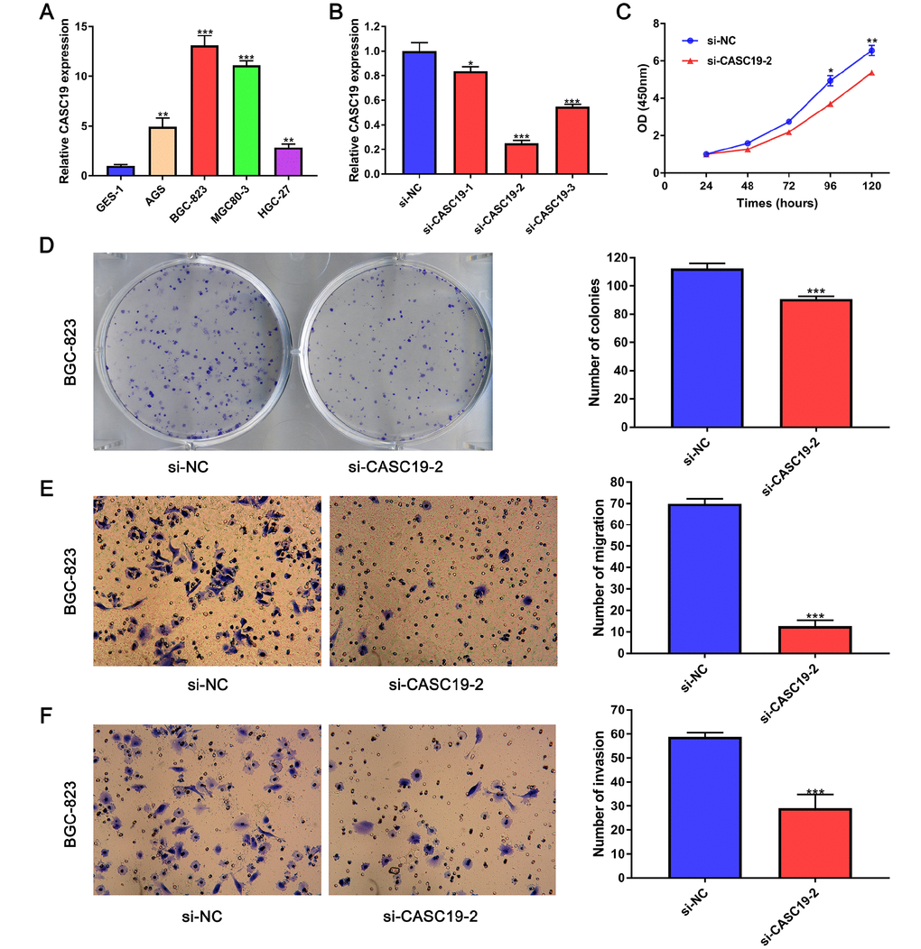 To further investigate the role of CASC19 in GC progression, we firstly determined CASC19 expression in four human GC cell lines (AGS, BGC-823, MGC-803, and HGC-27) and in a normal gastric mucosal epithelial cell line (GES-1) by quantitative real-time PCR (qRT-PCR). CASC19 expression was upregulated in all four GC cell lines, and especially in BGC-823 cells, compared to GES-1 cells (P < 0.001; Figure 6A). Thus, we selected the BGC-823 cell line to further explore the pathogenic mechanism of CASC19 in GC. To this end, CASC19 expression was downregulated in BGC-823 cells using three specific siRNAs targeting CASC19 (siCASC19). Based on the interference efficiency of these specific siRNAs, si-CASC19-2 was used in the following experiments (Figure 6B). The Cell Counting Kit-8 (CCK-8) assay showed that CASC19 knockdown significantly inhibited cell proliferation in BGC-823 cells (Figure 6C). Furthermore, the colony formation assay showed that the number and size of all colonies in the CASC19 knockdown group were significantly reduced compared with the control group (Figure 6D), indicating that CASC19 also promotes anchorage-independent growth of GC cells. Additionally, CASC19 knockdown markedly suppressed migration and invasion of BGC-823 cells (Figure 6E and 6F). These findings demonstrate that knockdown of CASC19 inhibits proliferation and metastasis in GC cells.