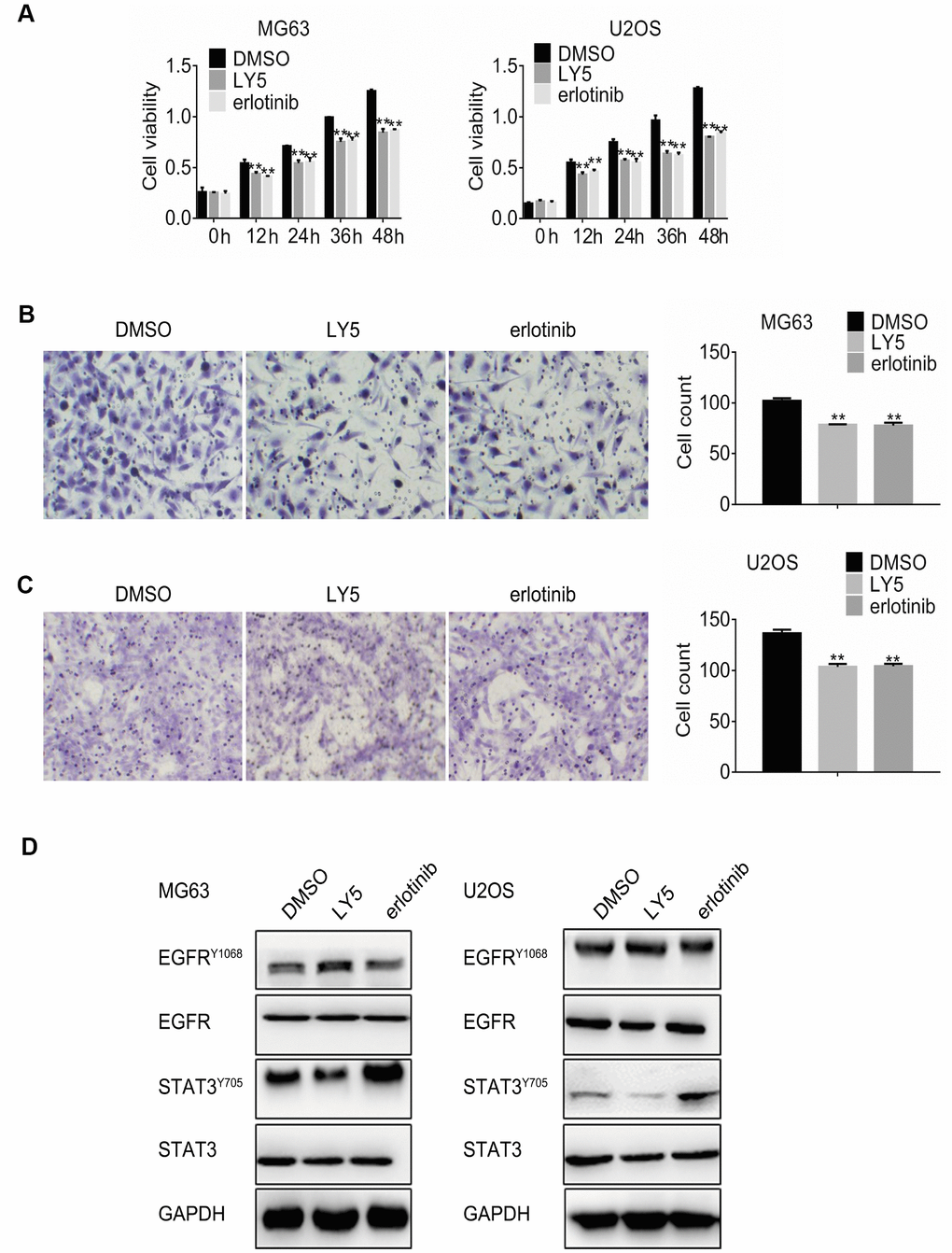 Abnormal EGFR expression and constitutive STAT3 activation have been described in osteosarcoma cells in relation to disease progression and chemotherapy resistance [4, 20]. To determine the effects of STAT3 and EGFR inhibition on osteosarcoma cell proliferation and migration, MG63 and U2OS cells were incubated with the STAT3 inhibitor LY5 (1μM) or the EGFR inhibitor erlotinib (1μM). MTT assay results showed that treatment with either LY5 or erlotinib reduced cell viability significantly compared to control (Figure 1A). Meanwhile, cell migration was also significantly reduced by both treatments (Figure 1B and 1C). Next, western blot was performed to further investigate EGFR and STAT3 phosphorylation status. Both phospho-Tyr705 STAT3 and phospho-Tyr1068 EGFR signals declined after treatment with the respective inhibitors (Figure 1D). However, feedback phosphorylation of EGFR and STAT3 was observed after treatment with LY5 and erlotinib, respectively, whereas no significant differences in EGFR or STAT3 expression were detected post-treatment.