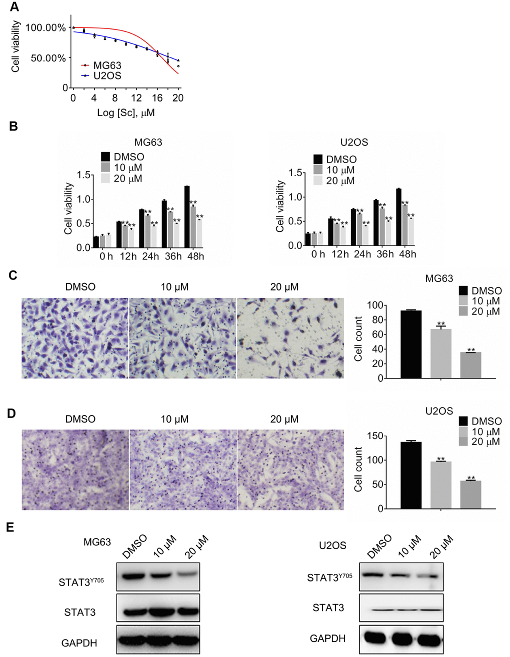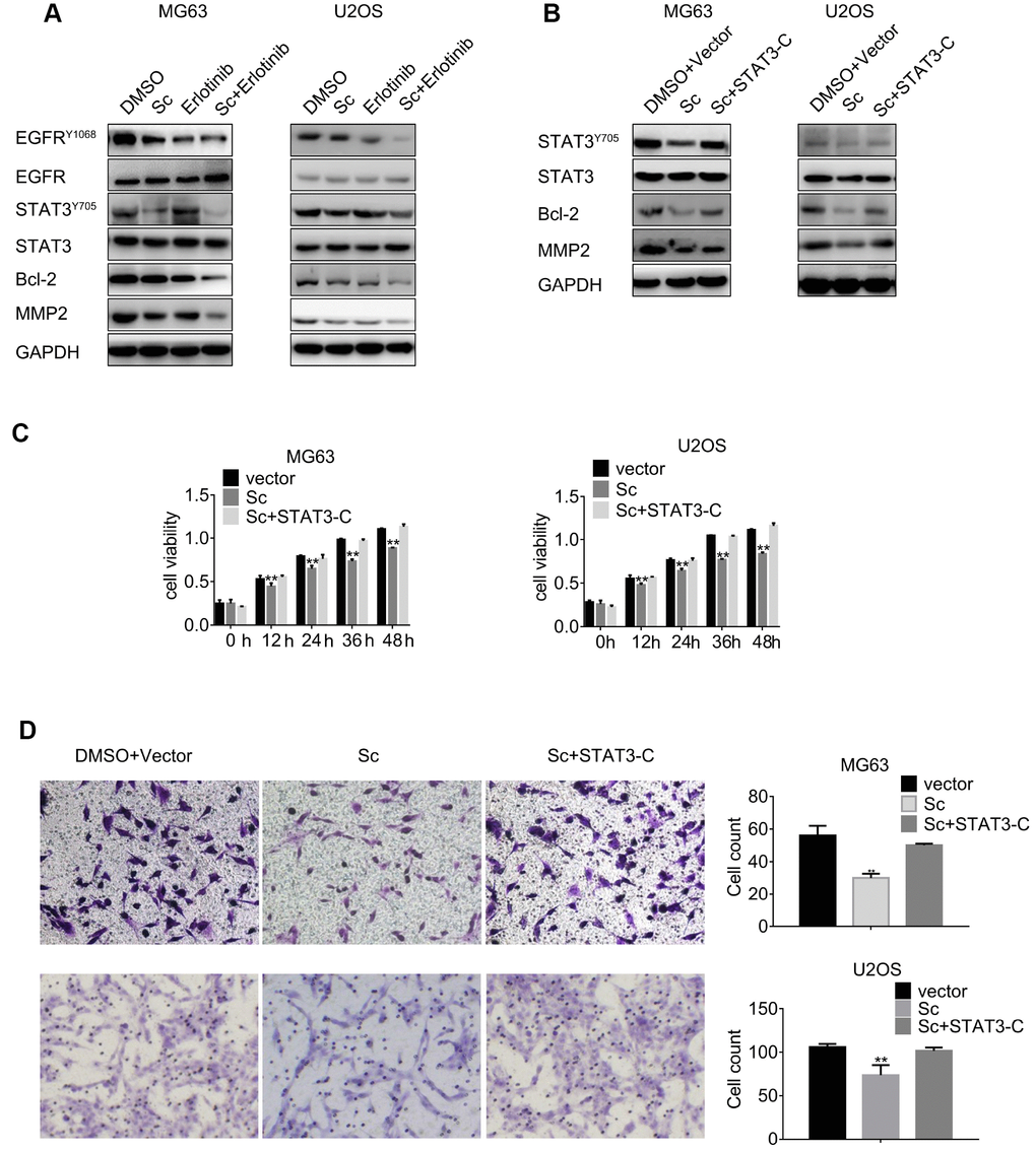 To further assess the link between SC exposure and STAT3 activation status, ectopic expression of constitutively active STAT3 (STAT3-C) was induced in MG63 and U2OS cells. Western blotting showed that STAT3-C rescued STAT3 phosphorylation in the presence of SC, and restored also Bcl-2 and MMP2 expression (Figure 4B). Cell viability and transwell migration assays were next performed in STAT3-C-transfected cells. Results showed that STAT3-C expression abrogated the anti-proliferative and anti-migratory effects of SC (Figure 4C and 4D). These data indicate that SC inhibits STAT3 phosphorylation and can prevent STAT3 feedback activation induced by the EGFR inhibitor erlotinib in osteosarcoma cells.