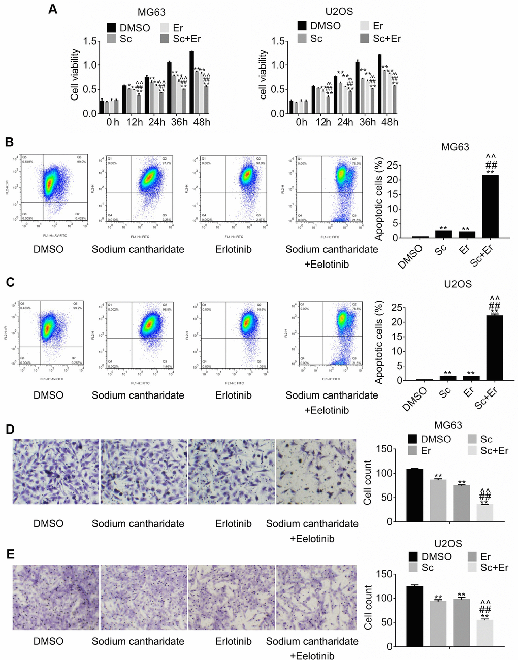 To explore the potential of combined treatment with SC and erlotinib, MG63 and U2OS cells were incubated with DMSO (control), SC, erlotinib, or a combination of SC and erlotinib for 24 h. Changes in cell viability were measured by MTT assay. As shown in Figure 3A, dual treatment with SC and erlotinib hampered cell growth to a greater extent than either drug alone. To examine the effect of this treatment combination on apoptosis, changes in mitochondrial membrane potential were evaluated through measurements of JC-1 fluorescence by flow cytometry. Consistent with data from cell viability assays, results showed that compared to control, single-drug exposure promoted a significant increase in apoptosis in MG63 cells, while combined treatment further raised the percentage of apoptotic cells (Figure 3B). Identical results were obtained in U2OS cells (Figure 3C). On the other hand, migration assays showed similar effects, namely significant reduction of migration by either drug alone, and compounded inhibition after combination treatment with SC and erlotinib (Figure 3D and 3E).