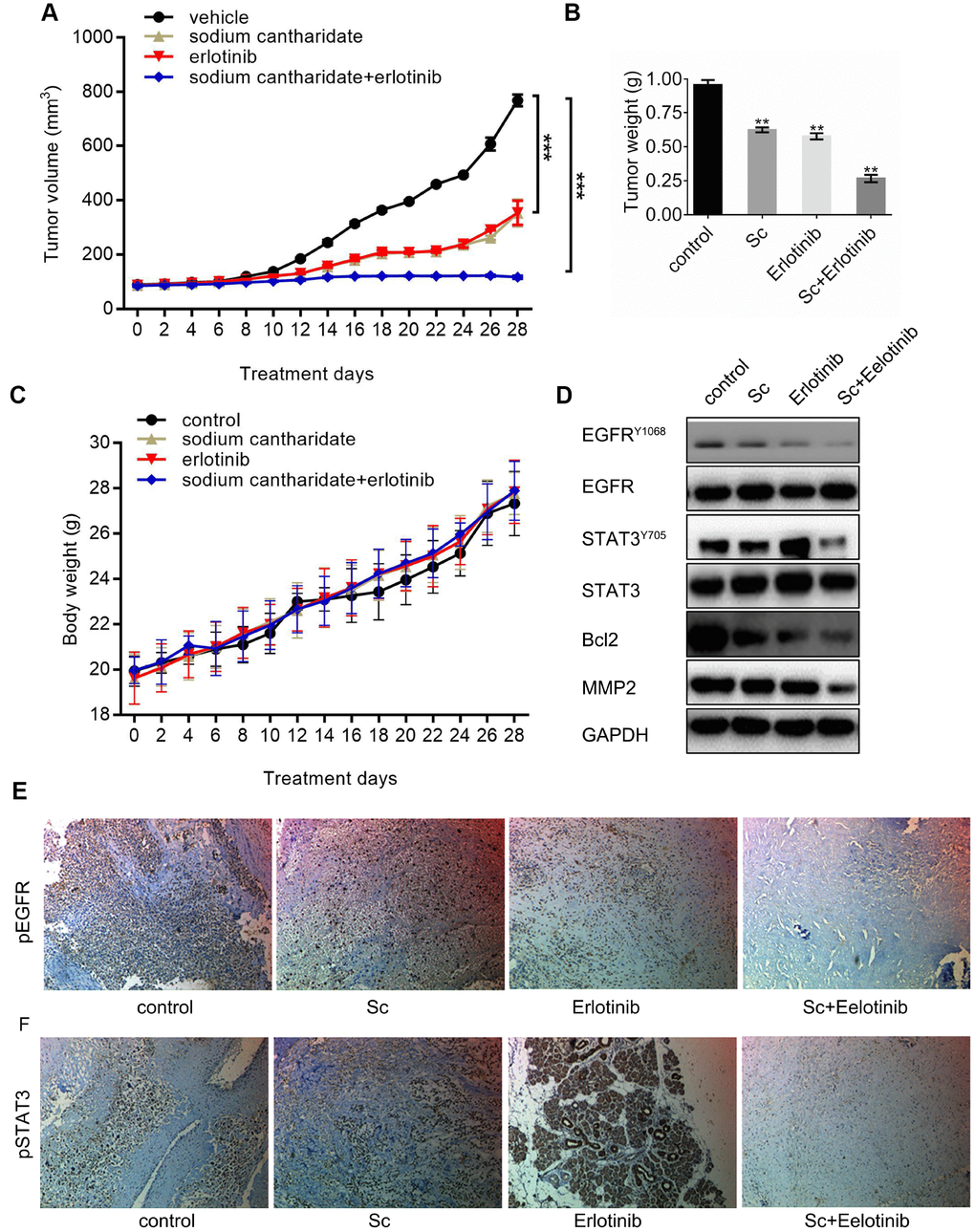 MG63 cell xenografts were generated in nude mice to investigate the effect of dual treatment with SC and erlotinib on tumor growth in vivo. Until sacrifice at day 28 post-implantation, mean tumor volume increased time dependently in mice treated with vehicle (saline), SC alone, erlotinib alone, or their combination (Figure 5A). Xenograft volumes of both SC- and erlotinib-treated mice did not vary from those of vehicle-treated mice until day 12, where they started to show slower growing kinetics. The effect was more pronounced in mice treated with the inhibitors combined, as significantly smaller tumors developed since day 8 post-inoculation (Figure 5A). At sacrifice, mean tumor wet weight in the drug combination group was ~70% lower than control, whereas for single drug treatments a ~40% decrease was recorded (Figure 5B). There were no differences in body weights among treatment groups at the end of the experiment, which suggests good treatment tolerability (Figure 5C). Western blotting was performed to verify the expression of phospho-EGFR and phospho-STAT3 in tumor tissues. As expected, erlotinib-induced STAT3 phosphorylation was reduced notably by SC, while phospho-EGFR levels declined after erlotinib-only and dual combination treatment. Meanwhile, the expression of Bcl-2 and MMP2 was downregulated in parallel with the decrease in phospho-STAT3 (Figure 5D). Lastly, supporting the results of western blots, IHC staining further confirmed reduced activation of EGFR (Figure 5E) and STAT3 (Figure 5F) after combined treatment with SC and erlotinib.