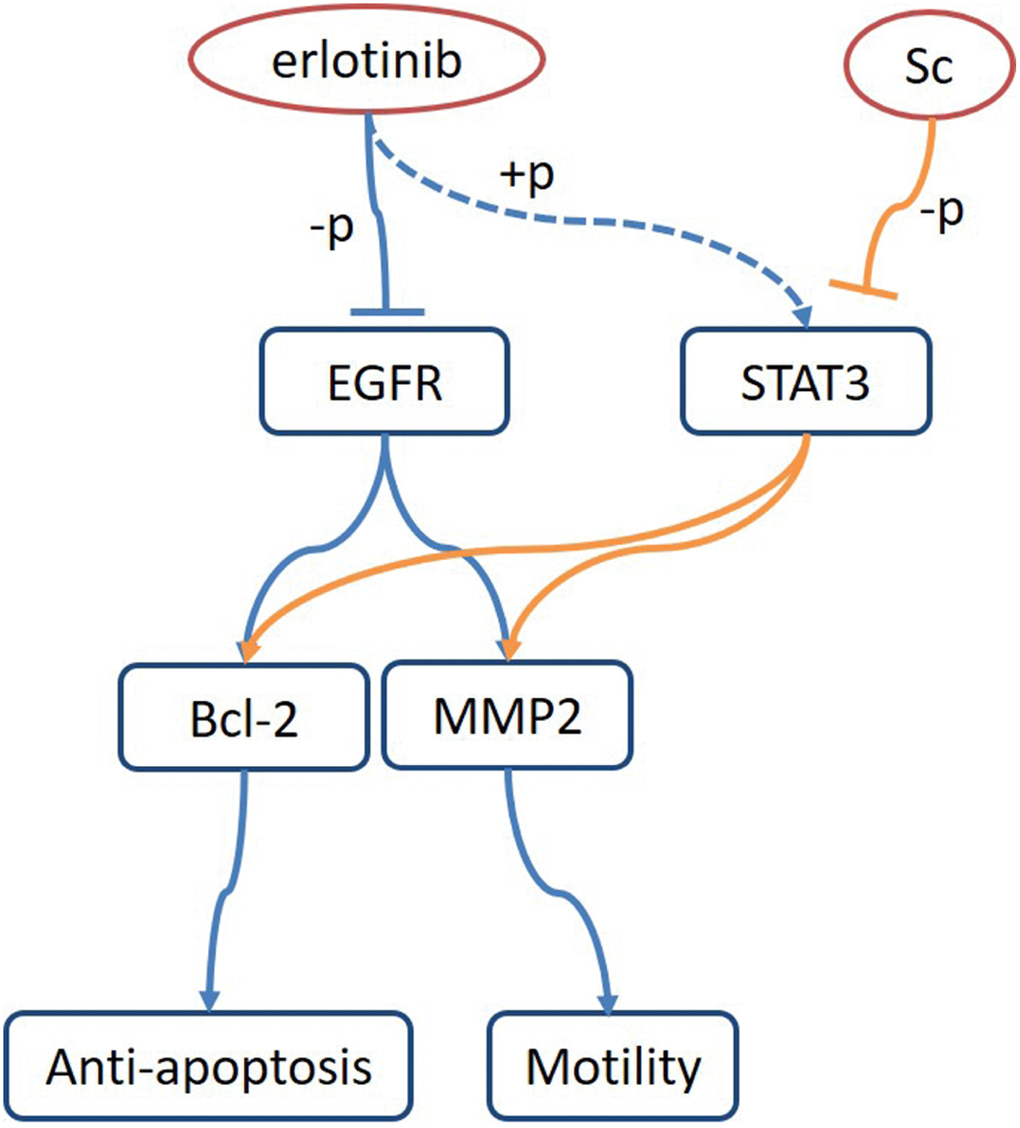 Multiple drug resistance mechanisms have been illustrated in diverse cancers. For example, the epidermal growth factor receptor (EGFR) T790M mutation impairs the interaction of inhibitory chemicals with the ATP-binding pockets of protein kinases, leading to acquired resistance to first- and second-generation EGFR-TKIs in non-small-cell lung cancer [6]. In lung and breast cancer, MET amplification was shown to mediate resistance to osimertinib (AZD9291) [7, 8]. Furthermore, overactivation of compensatory growth signaling cascades can contribute to cancer cell escape from anti-EGFR therapies. For instance, hyperactivation of STAT3 caused by EGFR inhibitors (STAT3 feedback activation) was shown to mediate resistance in lung cancer [9], colorectal cancer [10] and glioma [11]. Growth factors, e.g. EGF, c-MET, and platelet-derived growth factor receptor (PDGF) activate oncogenic Src, Ras, and members of the Janus kinase (JAK) family, driving phosphorylation of STAT3 in tumors. Phospho-STAT3 forms hetero- or homodimers which translocate to the cell nucleus to promote transcription of pro-survival target genes such as Bcl-2 and matrix metallopeptidase 2 (MMP2). Therefore, preventing STAT3 phosphorylation is an enticing strategy to defeat resistance to EGFR inhibitors such as erlotinib in various tumor types, including relapsed or refractory osteosarcoma.
