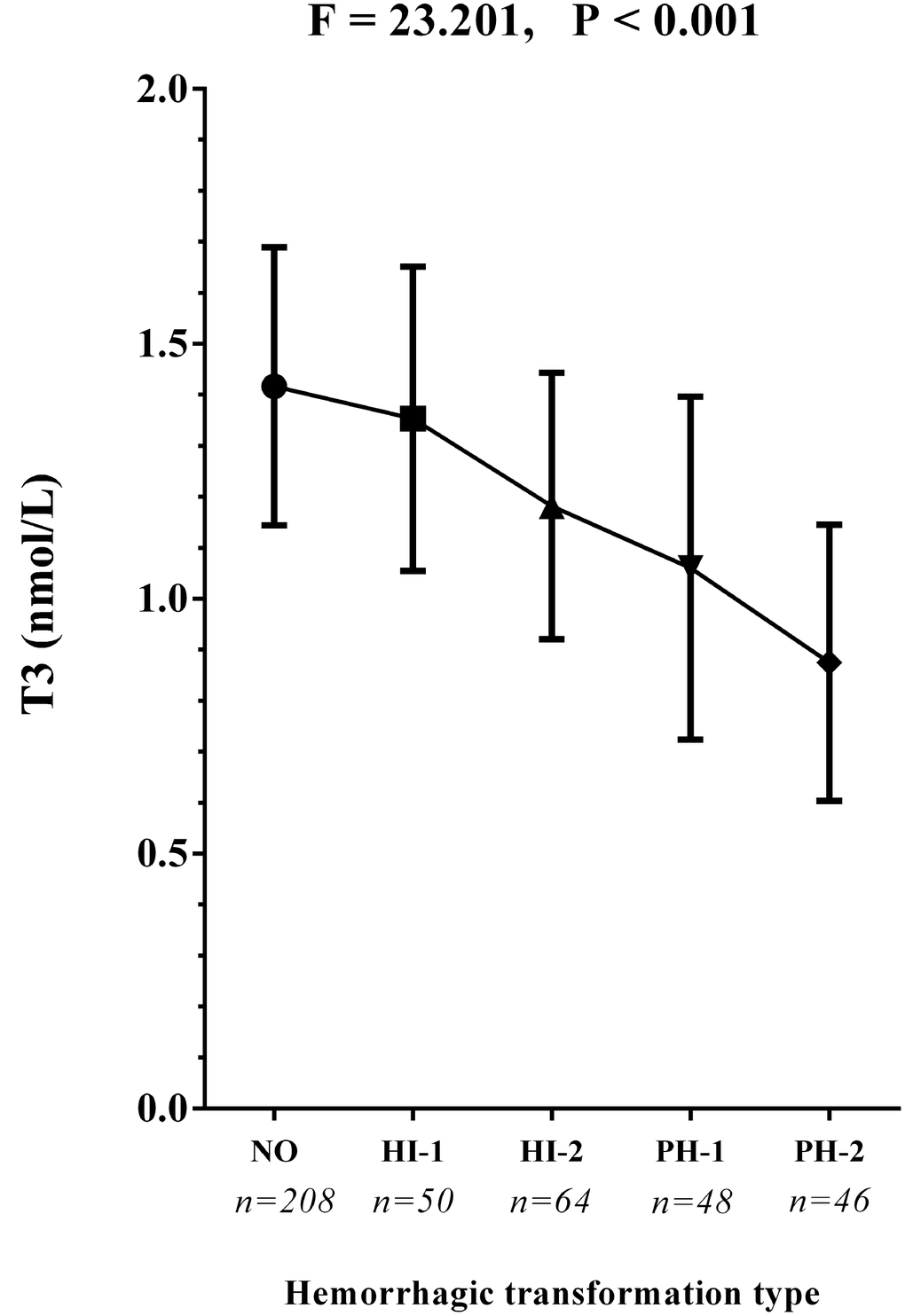 Baseline levels of total T3 and free T3 were significantly lower in patients with HT than without HT (1.1 mmol/l vs.1.4 mmol/l, P < 0.001; 4.1 mmol/l vs. 4.3 mmol/l, P < 0.001, respectively; Table 1). More patients with HT exhibited low T3 syndrome after ischemic stroke on admission than did those without HT (66.8% vs. 32.7%; chi-square test P <0.001; Table 1). As for the radiological status of HT, baseline levels of total and free T3 were also much lower in the subjects with PH than in those with HI (both P < 0.001; Table 2). Additionally, when compared to patients with HI, low T3 syndrome was more frequently detected in those with PH (P = 0.034; Table 2). Similar results were obtained upon comparison between patients with sHT and asHT . Figure 1 shows that T3 levels decreased in patients with HT as the condition worsened (P < 0.001 by ANOVA test).