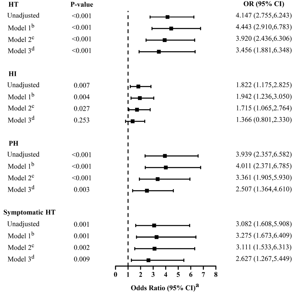 In univariate analyses, low T3 syndrome at baseline was always significantly associated with radiological and clinical HT (OR = 4.147, 95% CI = 2.755–6.243, P < 0.001; OR = 3.082, 95% CI = 1.608–5.908, P = 0.001, respectively; Figure 2), and with a higher risk of PH (OR = 3.939, 95% CI = 2.357–6.582, P < 0.001; Figure 2) than HI (OR = 1.822, 95% CI = 1.175–2.825, P = 0.007; Figure 2). Atrial fibrillation, baseline NIHSS score, systolic blood pressure (SBP), smoking and drinking status, baseline leukocyte counts, fibrinogen, total cholesterol, and use of anticoagulant, antiplatelet or lipid-lowering agents were also significantly associated with HT.