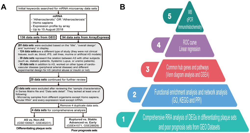 High-throughput technology has been utilized to identify differences in the expression levels of mRNAs between atherosclerotic plaques and normal tissues. These methods have the potential to recognize dozens or hundreds of differentially expressed mRNAs, although only a small portion of them might have real clinical utility as interventional targets. Finding an effective approach to combine various sources of data is important. Any difference in laboratory protocols or measurement platforms or small sample sizes could result in incomparable expression levels of genes. Therefore, researchers should analyze separate datasets and aggregate the resultant gene lists, as in the robust rank aggregation (RRA) [6] method. This approach has been used to define robust cancer-related gene sets [7] and miRNA sets [8–10]. However, this method has not been applied in AS research thus far.
