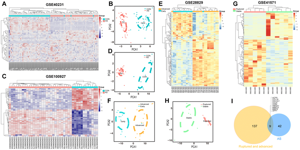 The expression profiles of poor prognosis sets were also analyzed; one had early or advanced carotid atherosclerotic plaques (GSE28829), and the other had stable carotid plaques compared with ruptured carotid plaques (GSE41571). After RRA analysis, 96 upregulated and 50 downregulated DEGs (Figure 2E, 2G and Supplementay Table 2) were identified. Their PCA plots also showed that the DEGs could clearly distinguish between the two groups in the poor prognosis sets (Figure 2F and 2H).