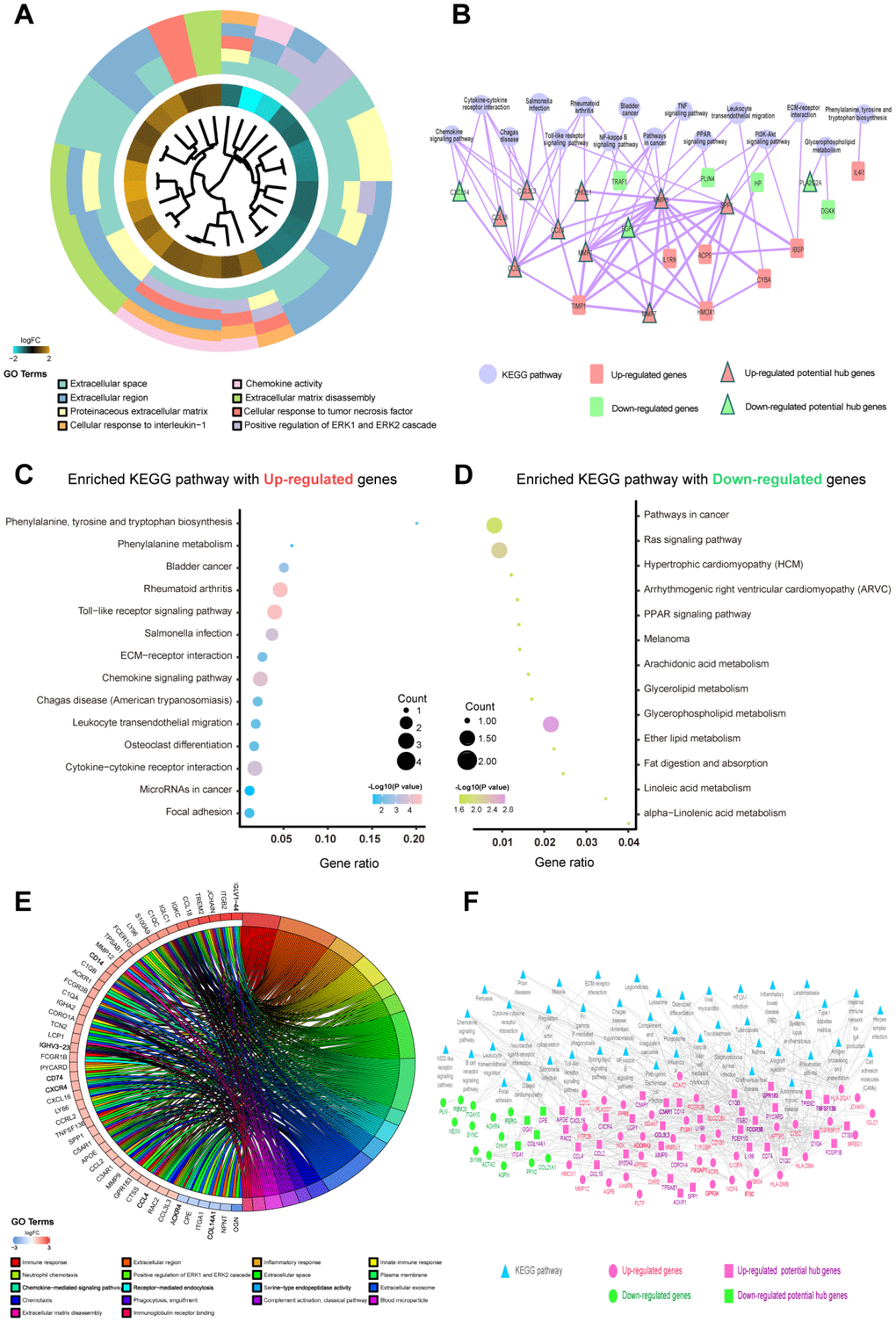 A total of 9 shared hub genes were identified by Venn diagram (Figure 2I); these genes were identified by ranking and trend consistency based on the DEGs after RRA analysis, but relying on this analysis alone is one-sided. Pathway aggregation is often used to predict importance, and thus, we further used Gene Ontology (GO), Kyoto Encyclopedia of Genes and Genomes (KEGG) and protein-level protein-protein interaction (PPI) analyses to identify the 51 DEGs of the differentiating plaque sets and 146 DEGs of the poor prognosis sets. In the differentiating plaque sets, a GOCluster plot (Figure 3A) visualized the interaction between clusters and genes of GO terms, and the biological processes of the 51 potential hub genes were shown to focus on cellular response towards tumor necrosis factor, ERK2 and ERK1 cascade–positive regulation and cellular response to interleukin-1. Under molecular function, the genes were enriched in chemokine activity, and the analysis of the cellular components suggested that the genes were markedly enriched within the extracellular region, proteinaceous extracellular matrix and extracellular space (Figure 3A and Supplementary Table 1). In the KEGG pathway analysis, upregulated genes of the differentiating plaque sets were greatly enriched in 14 significant pathways, including cytokine-cytokine receptor interaction, chemokine signaling pathway and Toll-like receptor signaling pathway (Figure 3C). The downregulated genes were involved in 13 pathways, including glycerophospholipid metabolism, fat digestion and absorption, and glycerolipid metabolism, which were highly significant (Figure 3D). Figure 3C and 3D and Supplementary Table 2 show the detailed numbers of involved genes and these pathways in individual bubbles. Then, using CytoNCA analysis of the results in the PPI network, we identified 31 nodes (i.e., key genes in PPI network analysis) with statistical significance from 51 potential hub genes of the original differentiating plaque sets based on three network parameters, including closeness centrality, betweenness centrality and degree centrality of the constructed network. Next, the genes obtained by the above analysis (PPI network, GO analysis and KEGG analysis) in the differentiated plaque sets and their relationship between the related pathways and their gene expression changes were collectively plotted in Figure 3B. These key potential hub genes will be highlighted and will be explored and validated in the poor prognosis sets.