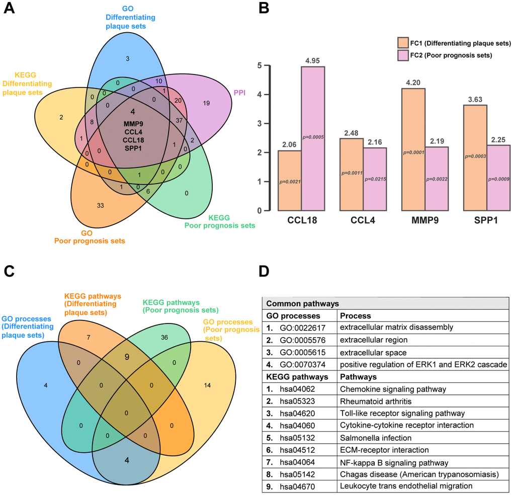 Venn diagram identification of the common differentially expressed genes and pathways of the differentiating plaque sets and poor prognosis sets