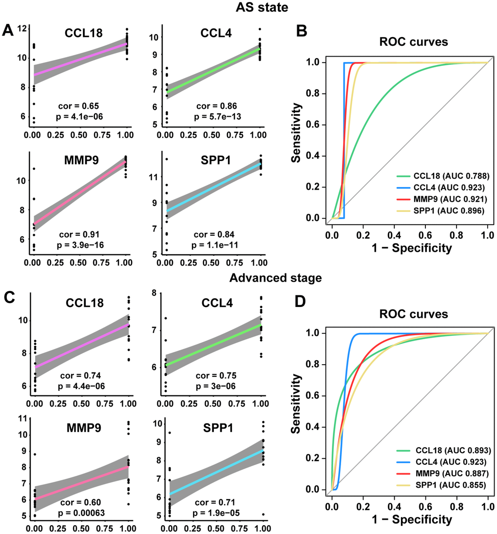 Therefore, our next step was to conduct ROC curve and linear regression analyses of these common hub genes. The linear regression analyses indicated that the four common hub genes (CCL18, CCL4, MMP9, and SPP1) were positively correlated with the AS state and the advanced stage (all p<0.005, Figure 5A and 5C). Their ROC curves confirmed that they could distinguish the AS state and the advanced stage (all p<0.05), and the AUCs were between 0.788 and 0.923 (Figure 5B and 5D).