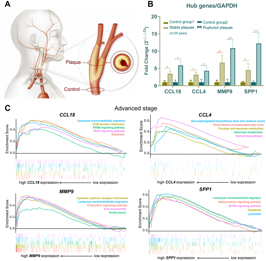 Third, there should be sufficient information on mRNA expression patterns within different specimen types. In the context of partial inconsistencies between plasma-based and tissue-based results [37], we focused on research that analyzed the expression of mRNAs between AS plaques and control tissues, further exploring if DEGs of the AS state were also in the plaques of advanced and ruptured stages, because we thought the results could be tissue-specific. Although some studies have reported that circulating mRNAs in plasma could be more convenient and timely to diagnose AS than other molecules, we focused on tissue-specific hub genes to provide targeted directions for subsequent drug interventions. Large sample data in previous studies confirmed that partly genes are elevated in the peripheral blood of patients with coronary heart disease or AS and indirectly demonstrated that they can also be monitored as noninvasive markers. Additionally, chemokines play important roles in the pathology of AS and related cardiovascular diseases. The human plaque samples of the previous studies came from fewer than 40 cases, and there may have been bias, so greater sample numbers would be more reliable and persuasive. The human plaque samples involved in the analysis in our study reached 120 cases (90 cases from the public database and 30 cases from clinical validation). Among the four mRNAs in this study, CCL18 was significantly upregulated in AS plaques. After strict filtering, the expression of CCL18 and SPP1 were still increased. The concentrations of SPP1 and CCL18 have been significantly and consistently upregulated within the local versus peripheral blood of acute myocardial infarction [38]. One review reported that high plasma SPP1 was related to the increased risk of major adverse cardiac events [39] and to the extent and presence of coronary artery disease [40]. Nevertheless, no studies have reported the function of SPP1 within carotid plaque tissues. In our study, all RNA levels and protein levels and the results of immunohistochemistry showed that SPP1 expression was obviously increased in ruptured carotid plaques. CCL4 has also been detected in human AS plaques [41], and its plasma level reflects the level of proatherogenic cytokines in plaque tissue [42]. These data, combined with our findings, support CCL4’s potential role in atherosclerotic disease and plaque vulnerability. MMP-9, one of the four hub genes, is a critical enzyme released from macrophages. Elevated serum MMP-9 is independently associated with plaque instability [43] and severity [44]. Another study revealed that the role of MMP9 in the degradation of atherosclerotic fibrous caps leads to fissures and eventually to acute thrombosis [45] and might be a target for unstable plaque treatment [46]. Therefore, MMP9 may be a tissue-specific potential diagnostic marker of the ruptured stage of AS. These data illustrated the reliability of our bioinformatics analysis. These findings provide a new idea for further exploration of the progression of AS.