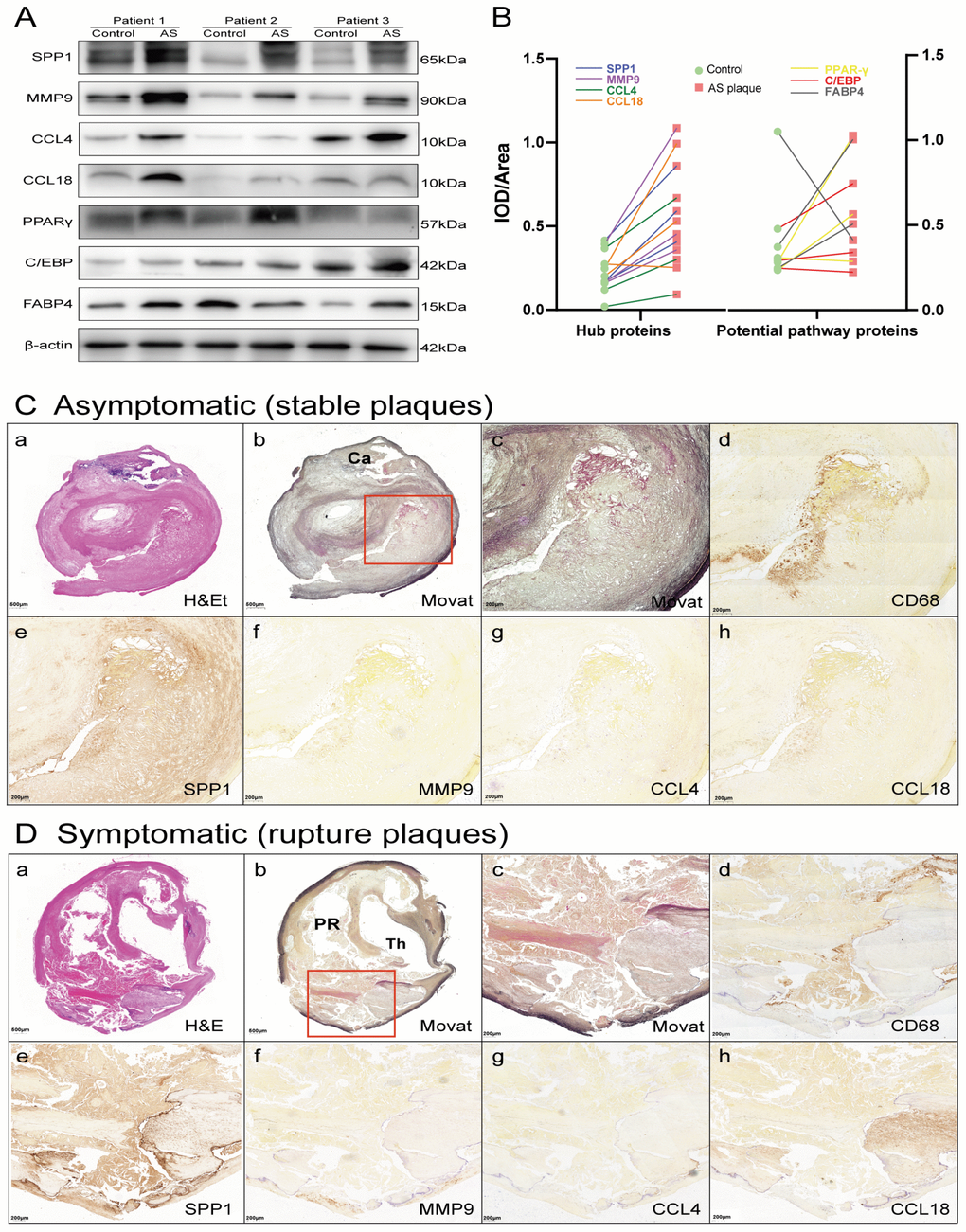 Tissue from the ruptured atherosclerotic plaque or control was lysed in ice-cold buffer containing 50 mM Tris-HCl, pH 7.4, 150 mM NaCl, 1% Triton X-100, 1% sodium deoxycholate, 0.1% SDS, sodium orthovanadate, and protease inhibitor cocktail (Beyotime, P1006, Shanghai, CHN) and 1 mM PMSF (Beyotime, ST506, Shanghai, CHN) for 30 minutes. Then, the insoluble material of tissue lysates was removed by centrifugation at 12000x g and 4°C for 30 minutes. After the protein concentration was measured (Beyotime, P0010S, Shanghai, CHN) and normalized to the total protein concentration, the tissue lysate was resuspended in SDS sample buffer and then denatured at 98°C for 5 minutes. Twenty micrograms of total protein was fractionated by electrophoresis on 12% or 10% polyacrylamide gels. The proteins were transferred electrophoretically onto a nitrocellulose membrane (Millipore, IPVH00010, Billerica, MA). After being blocked in 5% nonfat dry milk (BD Difco, 232100, New Jersey, US), the membrane was incubated with the appropriate primary antibodies overnight at 4°C. Proteins were detected by probing western blots with antibodies specific to β-actin (1:5000; ab8227, Abcam, Cambridge, UK), MMP9 (1:1000; ab76003, Abcam, Cambridge, UK), SPP1 (1:1000; ab214050, Abcam, Cambridge, UK), CCL4 (1:1000, ab45690, Abcam, Cambridge, UK), CCL18 (1:1000, ab104867, Abcam, Cambridge, UK), and adipogenesis markers (PPARγ, C/EBP FABP4, 1:1000, CST, Boston, US). Following incubation with horseradish peroxidase-conjugated secondary antibodies (Beyotime, A0208, Shanghai, CHN), the antigen-antibody complexes were detected with an enhanced chemiluminescence detection reagent kit (Thermo, 34577, Massachusetts, US). Protein bands were visualized with a double-color infrared laser imaging system (LI-COR Biotechnology, Nebraska, US). Densitometry analysis of the gels was carried out using ImageJ software from the NIH (http://rsbweb.nih.gov/ij/).