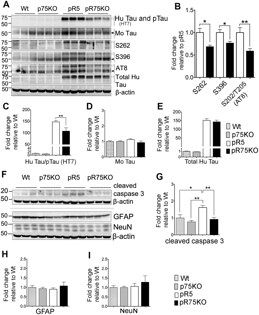 In the P301L mouse model, Tau mutation activates calpain, a protein reported to directly or indirectly activate caspase-3, thereby mediating the hyperphosphorylation of Tau [37]. We found that knocking out p75NTR can reduce the protein level of active caspase-3, shown here as cleaved caspase-3 (Figure 2F). The level of cleaved-caspase-3 was elevated in pR5 mice compared to Wt (p=0.0196) and p75KO (p=0.0013) and reduced in pR75KO mice (p=0.0075) (Figure 2G). Thus, the knockout of p75NTR is inhibiting the increase in caspase-3 activity caused by human Tau mutation in the pR75KO model. There was no evidence of gliosis, measured by GFAP, or neuronal loss, measured by NeuN, as a result of the Tau mutation and knockout of p75NTR as shown by western blotting (Figure 2A, 2H, 2I) and IHC (Supplementary Figures 3–4). Therefore, it is hard to conclude based on the increased caspase-3 activity alone that hyperphosphorylation of Tau in pR5 mice resulted in apoptosis. These results are consistent with the previous findings showing that gliosis and significant neuronal loss in this P301L mouse model become evident only from 10 months of age [38, 39], thus in this transgenic mice at 6 or 9 months of age examined here, we did not observe such changes.