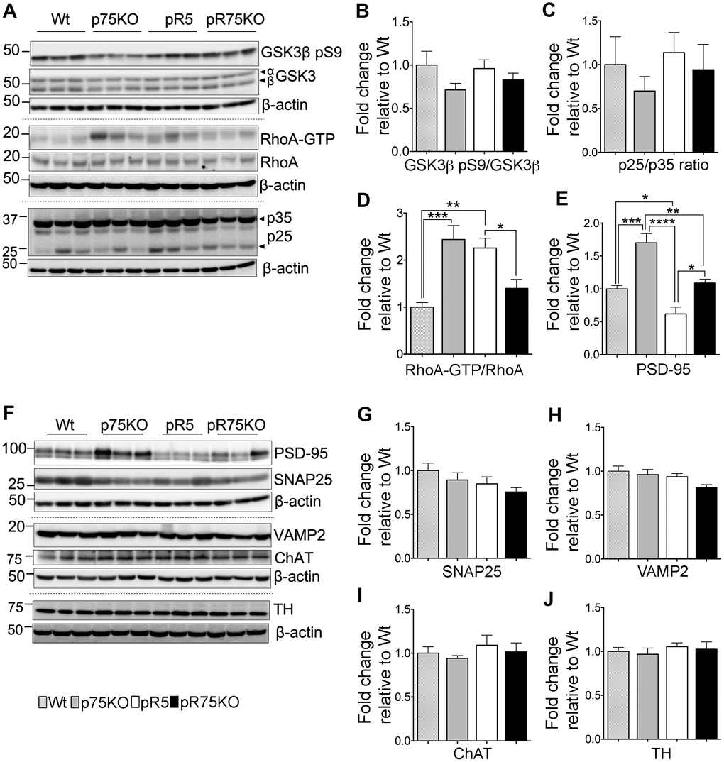 Inactive GSK3β (pS9) levels were significantly higher in p75KO (p=0.0001) and pR75KO mice (p=0.0142) (Figure 4F, 4G) compared to pR5 mice, suggesting that GSK3β is involved in Tau hyperphosphorylation in 9 months old pR5 mice. RhoA-GTP was significantly higher in pR5 mice compared to Wt (p=0.0171) and pR75KO (p=0.0126) (Figure 4F, 4H). The same reduction in p25/p35 ratio was observed in Wt (p=0.0181) and p75KO (p=0.0322) and pR75KO mice (p=0.0171) compared to pR5 mice (Figure 4F, 4I). These results confirmed that p75NTR functions in the hyperphosphorylation of Tau during aging possibly through the activation of kinases such as GSK3β, ROCK and Cdk5. Similarly, the level of cleaved caspase-3 was also elevated in aged pR5 mice (p=0.0066) compared to Wt mice (Figure 4F, 4J) while it was significantly reduced in aged pR75KO mice compared to pR5 mice (p=0.0049). In the older animals tested, p75NTR did not seem to influence presynaptic and post-synaptic proteins. SNAP25 and VAMP2 remained unchanged in all strains (Figure 4F, 4L, 4M). Although there is a subtle increase in PSD-95 in pR75KO mice, the increase remained insignificant (Figure 4F, 4K). TH, GFAP and ChAT remained unchanged in 9 months old animals similar to 6 months old animals (Figure 4F, 4N–4P). These results provide further evidence that the presence of p75NTR could promote the pathways that lead to the phosphorylation of Tau including activation of kinases, such as GSK3β, RhoA and Cdk5, and caspase-3